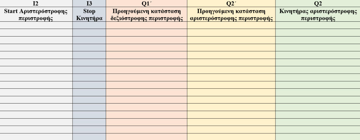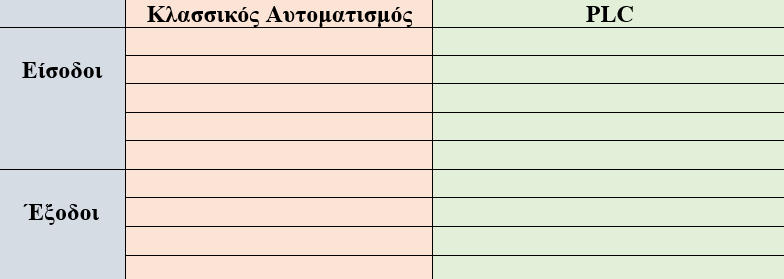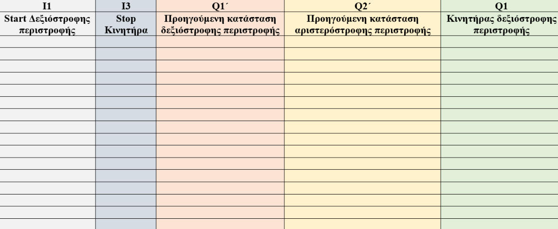 Τίτλος Άσκησης: Αλλαγή φοράς περιστροφής τριφασικού ΚινητήραΠρόβλημα: Επιθυμούμε την αλλαγή της φοράς ενός ασύγχρονου τριφασικού κινητήρα βραχυκυκλωμένου δρομέα . Σημείωση:ΌπωςήδηγνωρίζουμεαπότοεργαστήριοτηςΒΛυκείου,γιανααλλάξουμετηνφοράπεριστροφήςενόςτριφασικούκινητήρααρκείνααλλάξουμετιςδύοαπότις τρεις φάσεις τροφοδοσίας του κινητήρα .Σύνδεσημετηνπροηγούμενηάσκηση:Στηνπροηγούμενηάσκησημελετήσαμετηλειτουργίατηςμανδάλωσηςμεταξύδυοκινητήρων.Ουσιαστικάημανδάλωσηδυο κινητήρωναφοράστημανδάλωσητωνδυοηλεκτρονόμωνοιοποίοιτροφοδοτούντουςδυοκινητήρες.Στηνπαρούσαάσκηση,ηδαδικασίατηςμανδάλωσηςαφοράσεδυο ηλεκτρονόμουςοιοποίοιελέγχουντηφοράπεριστροφήςενόςτριφασικούκινητήρα-μετονένανηλεκτρονόμοοκινητήραςπεριστρέφεταιδεξιόστροφακαιμετονάλλο ηλεκτρονόμο ο κινητήρας περιστρέφεται αριστερόστροφα.Χαρακτηρισμός εισόδων και εξόδων του PLCΣυνδεσμολογίαΣτη συνέχεια συμπληρώστε τoς ακόλουθους πίνακες αληθείας. Προσπαθήστε για κάθε συνδυασμό εισόδων να αποφασίσετε την κατάσταση της εξόδου.Υπενθυμίζουμεότιόταναπότομπουτόνπερνάειρεύμαθεωρούμεότιηκατάστασητουείναι1ενώότανδενπερνάειρεύμααπότομπουτόν,ηκατάστασητουείναι0.Επίσης όταν η έξοδος είναι ενεργοποιημένη, η κατάσταση του είναι 1 ενώ όταν η έξοδος δεν είναι ενεργοποιημένη, η κατάσταση του είναι 0.Τέλος, με Q΄ χαρακτηρίζουμε την προηγούμενη κατάσταση της εξόδου ενώ με Q την παρούσα κατάσταση της εξόδου.Θαπαρατηρήσετεότιθαπρέπεινασυμπληρώσουμεδυοπίνακεςαληθείας.Αυτόσυμβαίνειεπειδήέχουμεδυοεξόδουςοιοποίοιενεργοποιούνταιαπόδιαφορετικές εισόδους. Οπότε συμπληρώνουμε έναν ξεχωριστό πίνακα αληθείας για κάθε έξοδο.Πίνακες αληθείαςΑνσυγκρίνουμετησυνδεσμολογίατουαυτοματισμούμετουςεπόμενουςπίνακεςαληθείας,θαπαρατηρήσουμεότιστουςπίνακεςαληθείαςδενεμφανίζονταιηκλειστήκαιη ανοικτήεπαφήτουθερμικού.Αυτόέγινεώστεναμηνγίνουναρκετάμεγάλοιοιπίνακαςαληθείας-ανπροσθέσουμεδυοεισόδους,τότεοαριθμόςτωνσυνδυασμόςθα αυξηθείαπό16σε64σεκάθεπίνακααληθείας.Οπότεδενυπολογίζουμεστουςπίνακεςαληθείαςτιςδυοεπαφέςτουθερμικούαλλάθατιςπροσθέσουμεστοπρόγραμματου αυτοματισμού.ΤοίδιοθαισχύσεικαιγιατιςεξόδουςQ3καιQ4-ενδεικτικέςλυχνίαεςΗ1καιΗ2-οιοποίεςθαενεργοποιούνταισεπερίπτωσηδεξιόστροφηςή αριστερόστροφης περιστροφής αντίστοιχα.Για την δεξιόστροφη περιστροφήΓια την αριστερόστροφη περιστροφήΣτη συνέχεια εξάγετε τις μαθηματικές εξισώσεις - μία για κάθε πίνακα αληθείας. Υπενθυμίζουμε ότι μας ενδιαφέρουν οι συνδυασμοί εισόδων που δίνουν έξοδο 1. Μαθηματική ΕξίσωσηΤέλος συμπληρώστε τους πίνακες Karnaugh, απλοποιήστε τις εξισώσεις και γράψτε το αντίστοιχο πρόγραμμα λειτουργίας αυτοματισμού σε οποιαδήποτε γλώσσα επιθυμείτε. Απλοποίηση με πίνακα Karnaugh Για τον πρώτο κινητήρα Για τον δεύτερο κινητήραΑπλοποιημένη ΕξίσωσηΠρόγραμμα λειτουργίας του αυτοματισμούΣΥΜΠΕΡΑΣΜΑ