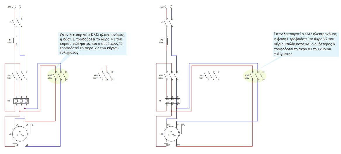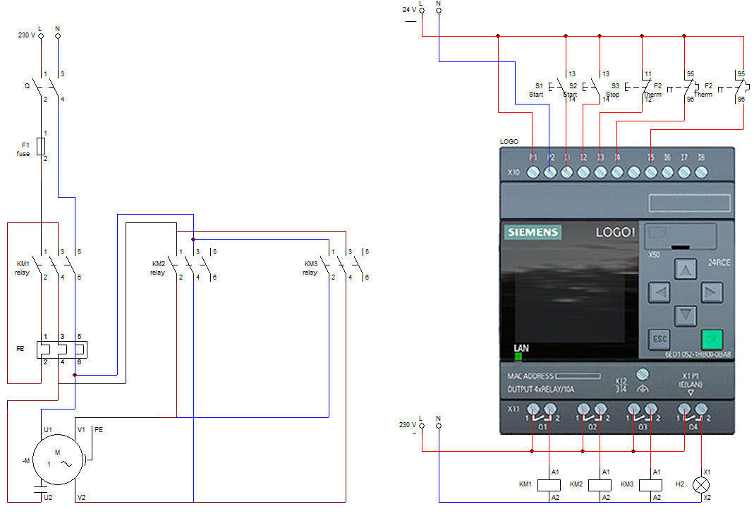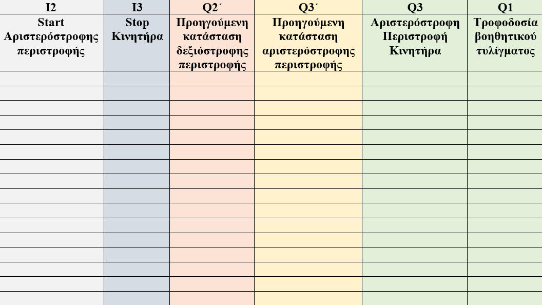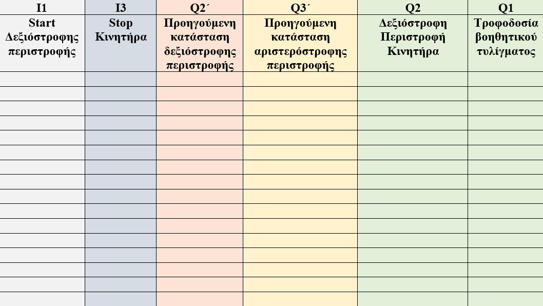 Τίτλος Άσκησης: Αλλαγή φοράς περιστροφής ασύγχρονου μονοφασικού κινητήραΠρόβλημα:Θέλουμεναελέγξουμετηφοράπεριστροφήςενόςασύγχρονουμονοφασικούκινητήρα,δηλαδήνεελέγξουμε-πέρααπότηνεκκίνησηκαιτηνπέδησητουκαθώςκαι την προστασία του από υπερφορτίσεις- τη φορά με την οποία θα περιστρέφεται. Λίγαλόγιαγιατηνφοράπεριστροφήςενόςασύγχρονουμονοφασικούκινητήρα:όπωςήδηαναφέραμεστηνπροηγούμενηάσκηση,έναςασύγχρονοςμονοφασικός κινητήραςαποτελείταιαπόδυοδιαφορετικάτυλίγματα-τοκύριοτύλιγμακαιτοβοηθητικό.Γιαναμπορέσουμενααλλάξουμετηφοράπεριστροφήςσεένανασύγχρονο μονοφασικόκινητήρα,αρκείνααλλάξουμετηνπολικότητασεένααπόταδυοτυλίγματα-είτεστοκύριοτύλιγμαείτεστοβοηθητικό.Μεαυτόντοντρόποαλλάζουμετηφορά περιστροφής του μαγνητικού πεδίου που αναπτύσσεται στον στάτη και συνεπώς τη φορά περιστροφής του δρομέα.Σύνδεσημετηνπροηγούμενηάσκηση:Στηνπροηγούμενηάσκηση-Εκκίνησημονοφασικούκινητήραεναλλασσόμενουρεύματος-αναφερθήκαμεστοντρόποελέγχουενός ασύγχρονουμονοφασικούκινητήρα.Σεαυτήτηνάσκηση,θαπάμεέναβήμαπαραπέρα-πέρααπότονέλεγχοτουκινητήραθαμάθουμενααλλάζουμεκαιτηφοράπεριστροφής του.Ηλογικήστηνοποίαστηρίζεταιηαλλαγήτηςφοράςπεριστροφήςτουασύγχρονουμονοφασικούκινητήραείναιίδιαμετηναλλαγήτηςφοράςπεριστροφήςτου ασύγχρονουτριφασικούκινητήρα-καιστιςδυοπεριπτώσειςαρκείνααλλάξουμετηφοράτουστρεφόμενουμαγνητικούπεδίου.Απλά,σεεπίπεδοεφαρμογής,οιδυοκινητήρες διαφέρουν κατασκευαστικά και συνεπώς διαφέρουν και οι τρόποι με τους οποίους αλλάζουμε τη φορά περιστροφής τους.Χαρακτηρισμός εισόδων και εξόδων του PLCΕξήγησηκυκλώματοςισχύος:Τοκύκλωμαισχύοςπεριλαμβάνειτρειςηλεκτρονόμους-ΚΜ1,ΚΜ2καιΚΜ3.ΟΚΜ1ηλεκτρονόμοςτροφοδοτείένααπόταδυοτυλίγματατου κινητήρα-στηνπροκειμένηπερίπτωσητοβοηθητικότύλιγμα-μετηνεναλλασσόμενητάσητουδικτύου.Οιάλλοιδύοηλεκτρονόμοι-ΚΜ2καιΚΜ3-ελέγχουντηνφορά περιστροφήςτουκινητήρα.ΑυτόεπιτυγχάνεταιδιότιοίδυοηλεκτρονόμοιΚΜ2καιΚΜ3τροφοδοτούντοκύριοτύλιγματουκινητήραμετηνπαροχήτουδικτύουμεν,αλλάμε αντίθετη πολικότητα. ΣυνδεσμολογίαΕπισήμανση:υπάρχουνδιάφορεςπαραλλαγέςγιατοκύκλωμαισχύοςτουσυγκεκριμένουαυτοματισμού.Γιαπαράδειγμα,μιααπόαυτέςτιςπαραλλαγέςχρησιμοποιείδύο ηλεκτρονόμους των τεσσάρων επαφών ο καθένας. Μπορείτε να σχεδιάσετε κάποια παραλλαγή του αυτοματισμού που θεωρείτε ευκολότερη; Στη συνέχεια συμπληρώστε τον ακόλουθο πίνακα αληθείας. Προσπαθήστε για κάθε συνδυασμό εισόδων να αποφασίσετε την κατάσταση της εξόδου.Υπενθυμίζουμεότιόταναπότομπουτόνπερνάειρεύμαθεωρούμεότιηκατάστασητουείναι1ενώότανδενπερνάειρεύμααπότομπουτόν,ηκατάστασητουείναι0.Επίσης όταν η έξοδος είναι ενεργοποιημένη, η κατάσταση του είναι 1 ενώ όταν η έξοδος δεν είναι ενεργοποιημένη, η κατάσταση του είναι 0.Τέλος, με Q΄ χαρακτηρίζουμε την προηγούμενη κατάσταση της εξόδου ενώ με Q την παρούσα κατάσταση της εξόδου.Πίνακες αληθείαςΑνσυγκρίνουμετησυνδεσμολογίατουαυτοματισμούμετουςεπόμενουςπίνακεςαληθείας,θαπαρατηρήσουμεότιστουςπίνακεςαληθείαςδενεμφανίζονταιηκλειστήκαιη ανοικτήεπαφήτουθερμικού.Αυτόέγινεώστεναμηνγίνειαρκετάμεγάλοιοιπίνακεςαληθείας-ανπροσθέσουμεδυοεισόδους,τότεοαριθμόςτωνσυνδυασμόςθααυξηθείαπό 16σε64σεκάθεπίνακααληθείας.Οπότεδενυπολογίζουμεστουςπίνακεςαληθείαςτιςδυοεπαφέςτουθερμικούαλλάθατιςπροσθέσουμεστοπ