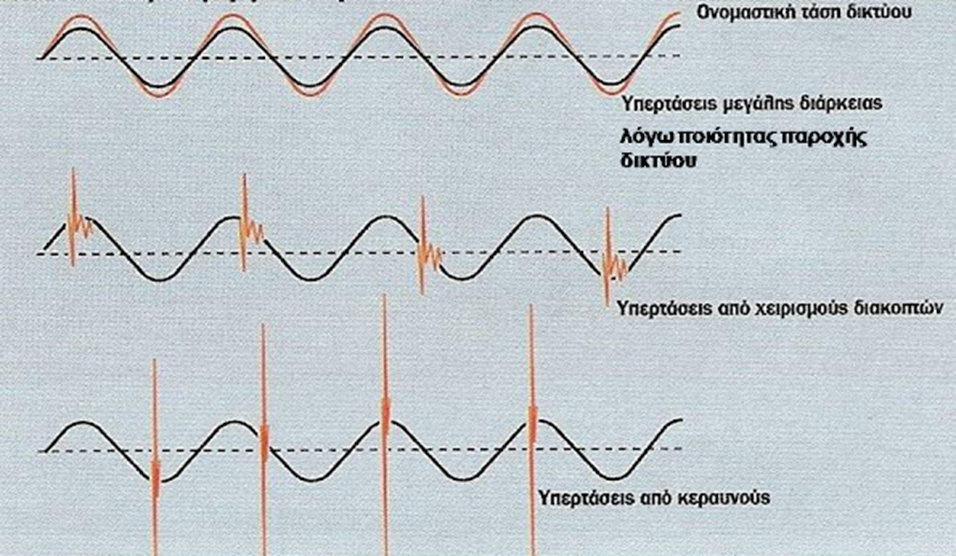 Οιυπερτάσειςμεγάληςδιάρκειας(ms…s)οφείλονταιστην ποιότηταπαροχήςτουδικτύουκαιαντιμετωπίζονταιμε σταθεροποιητέςτάσεως,UPSκτλ.Οιυπερτάσειςαπόχειρισμούς διακοπτώνόπωςκαιαπόκεραυνούςονομάζονταικρουστικές υπερτάσειςκαθώςέχουνμικρήδιάρκεια(μs)αλλάμεγάληαπόλυτη τιμή(kV)καιαντιμετωπίζονταιμετουςαπαγωγούςκρουστικών υπερτάσεων.Οιπλέονκαταστροφικέςκαιδύσκολεςσε αντιμετώπιση είναι οι υπερτάσεις οφειλόμενες σε κεραυνούς.