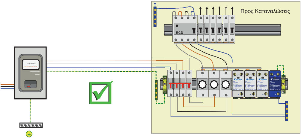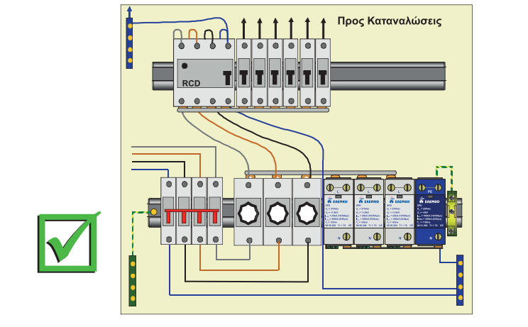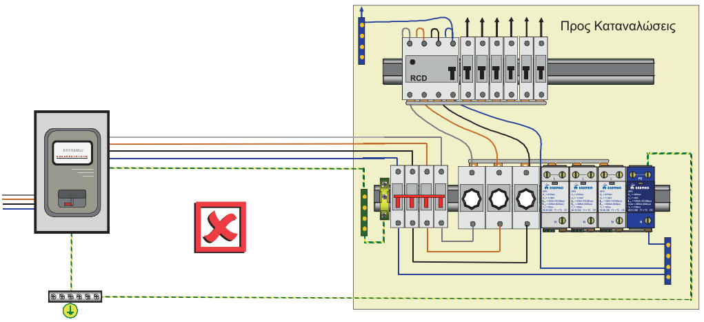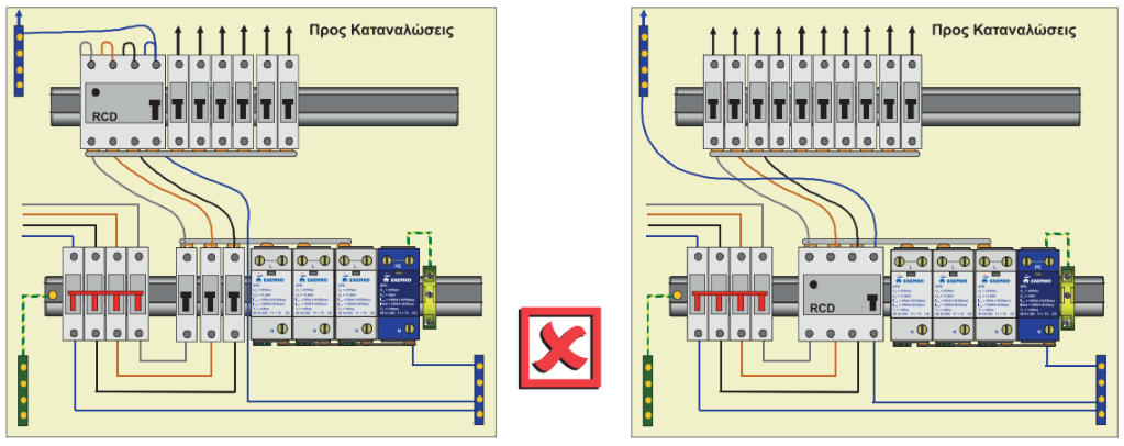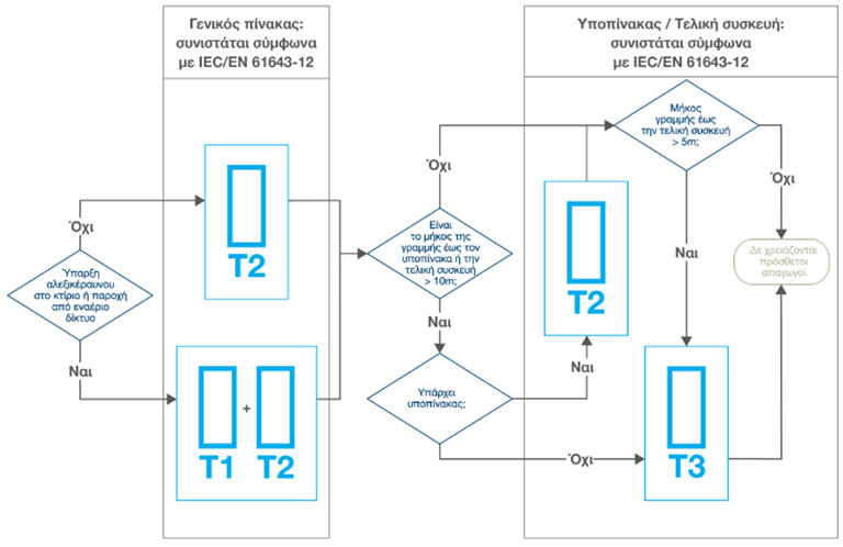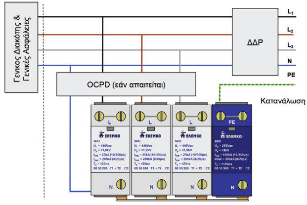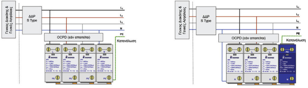 Τοιδανικότεροσημείοεγκατάστασηςτωναπαγωγώνγιατην προστασίατουσυνόλουτηςηλεκτρικήςεγκατάστασηςείναι αμέσωςμετάτονμετρητήτηςηλεκτρικήςπαροχής,τονγενικό διακόπτηκαιτιςγενικέςασφάλειεςκαιπριντηνκεντρικήήτις επιμέρους Διατάξεις Διαφορικού Ρεύματος – ΔΔΡ (ρελέ διαφυγής).ΣτοσημείοαυτόεφόσοντοσύστημαείναιΤΤ,ησυνδεσμολογία τωναπαγωγώνπρέπειναείναι3+1(CT2βάσειΕΛΟΤHD60364–5 - 534).Συνδεσμολογία3+1σημαίνειότι3απαγωγοίσυνδέονταιμεταξύ φάσεων(L)καιουδετέρου(N)καιέναςαπαγωγός(διαφορετικής τεχνολογίαςαποτουςαπαγωγούςL-N)συνδέεταιμεταξύ ουδετέρου (N) και γείωσης (PE).Σεμονοφασικόσύστημαπραγματοποιείταιπαρόμοια συνδεσμολογίαπουκαλείται1+1.Σεαντίθεσηησυνδεσμολογία 4+0σημαίνειότι4απαγωγοίίδιαςτεχνολογίαςσυνδεόνταιμεταξύ φάσεων/ουδετέρου και γείωσης.ΕφόσονηεγκατάστασηπριντηνκεντρικήήτιςκεντρικέςΔιατάξεις ΔιαφορικούΡεύματος–ΔΔΡδενείναιεφικτή,οιαπαγωγοί μπορούνναεγκατασταθούνείτεσεσυνδεσμολογία3+1είτεσε συνδεσμολογία4+0(CT1βάσειΕΛΟΤHD60364–5–534ηοποία σε συστήματα ΤΤ είναι επιτρεπτή μόνο μετά από ΔΔΡ).ΕπιπλέονβάσειτουΕΛΟΤHD60364–5–534ηΔΔΡθαπρέπεινα είναι Type S.ΕπιπρόσθεταγιατηνεγκατάστασημετάαπόΔΔΡθαπρέπεινα τονιστείότιγιακρουστικάρεύματαμεγαλύτερααπό3kA8/20μs υπάρχειοκίνδυνοςναανοίξειηΔΔΡδιακόπτονταςτηνηλεκτρική παροχή.Σεόλεςτιςπεριπτώσεις,ηπροστασίααπόυπερένταση(OCPD)θα πρέπειναικανοποιείτιςαπαιτήσειςτουκατασκευαστήτων απαγωγώναλλάναείναικαισεσυντονισμόμετιςγενικές ασφάλειες της παροχής