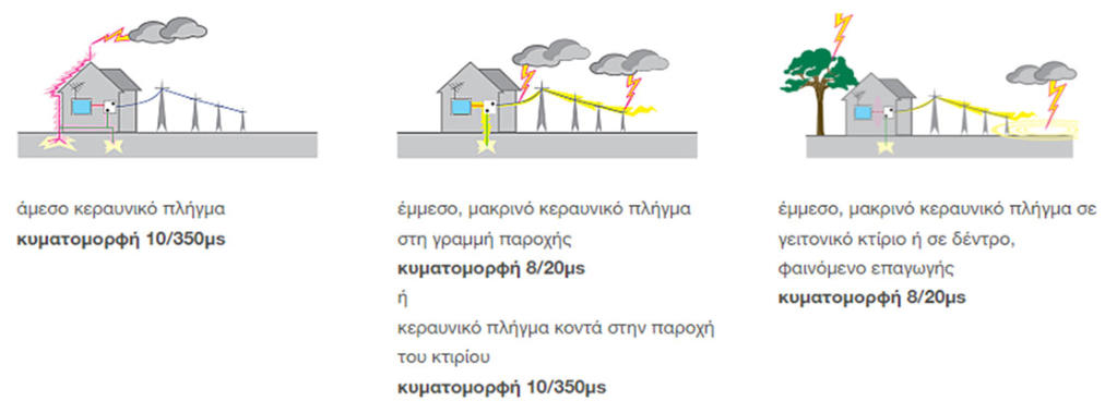 Αντικεραυνική προστασία με απαγωγούς υπερτάσεων (SPDs: Surge protection devices)Ηπτώσηενόςκεραυνούμπορείναπροκαλέσεισοβαρέςζημιέςσε μιαηλεκτρολογικήεγκατάστασητομέγεθοςτωνοποίωνμπορείνα είναιακόμακαιολοκληρωτικήκαταστροφή.Τομέγεθοςτης καταστροφήςεξαρτάταισεμεγάλοβαθμόαπότομέγιστορεύμα καιτηνμορφήτουκεραυνού.Οκεραυνόςείναιμιαφυσικήπηγή ρεύματοςτουοποίουηροήδημιουργείείτεωμικάείτεεπαγωγικά κατάκύριολόγοτιςκρουστικέςυπερτάσεις.Καθώςοικεραυνοί είναιέναφυσικόφαινόμενοδενείναιόμοιοιμεταξύτουςκαθώςη ενέργειακαιημορφήτουςκάθεφοράμπορείναδιαφέρει.Μετά απόπολυετείςέρευνεςκαικαταγραφέςτουφυσικούαυτού φαινόμενουωςμέγιστητιμήενόςκεραυνούθεωρούνταιτα200kA με κρουστική κυματομορφή 10/350μs [ΕΛΟΤ ΕΝ 62305 – 1].