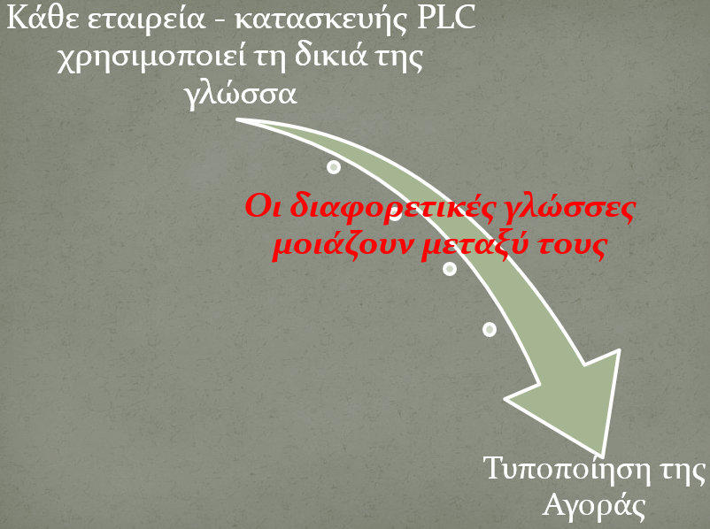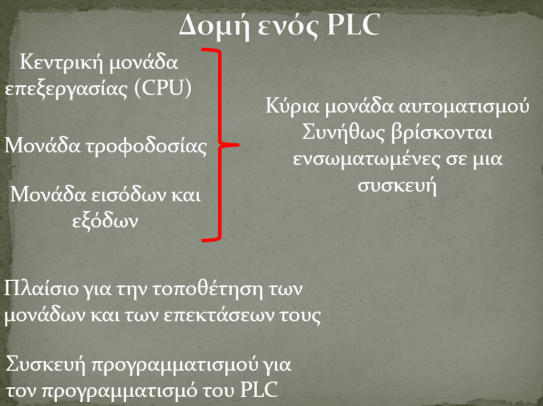 1 ΓενικάΑυτοματισμόςείναιτοπεδίοτηςεπιστήμηςκαιτηςτεχνολογίαςπουασχολείταιμετιςμηχανέςκαιτιςδιατάξεις,πουεκτελούντιςαναμενόμενες λειτουργίες "από μόνες τους", δηλαδή χωρίς την καταβολή ανθρώπινης προσπάθειας.Ειδικότερα, ο Αυτοματισμός περιλαμβάνει:•εξέτασηκαικατανόησητωνμηχανισμώνμέσωτωνοποίωνέναφαινόμενοοδηγείταιστοναέχειτημιαήτηνάλλησυμπεριφορά.Αυτήηαντίληψητων αιτίωνπουκαθορίζουντιςλειτουργίεςενόςφαινομένουονομάζεταικαιανάλυσητωνσυστημάτων-τυποποίησηςµίαςδιαδικασίαςµέσααπότην εύρεση ενός αριθµού βηµάτων – σταδίων τα οποία είναι καλά ορισµένα µεταξύ τους και εφόσον ακολουθηθούν παράγεται το επιθυµητό αποτέλεσµα•τονέλεγχο,δηλαδήτηνεπιβολήσταφαινόμενατηςεπιθυμητήςήτηςσυμφέρουσαςσυμπεριφοράςή,ακόμη,τηναποτροπήμιαςεπικίνδυνηςή ζημιογόνας εξέλιξης - ένας αλγόριθµος ο οποίος οδηγεί στην επίλυση ενός προβλήµατος Εμείς, σε αυτό το μάθημα, θα ασχοληθούμε με συστήματα αυτοματισμού με χρήση ελεγκτών PLC Ας δούμε όμως, αρχικά, πως καταλήξαμε στους Προγραμματιζόμενους Λογικούς Ελεγκτές2. Εξέλιξη των ΑυτοματισμώνΣήµεραοιιστορικοίθεωρούνότιοαυτοµατισµόςκαιτασυστήµατααυτοµάτουελέγχουαποτελούντοπιοσηµαντικόεπίτευγµαπουπέτυχεοάνθρωπος κατάτηνπερίοδοτηςµετάβασηςτουαπότηνπροβιοµηχανικήστηβιοµηχανικήπερίοδο(18οςκαι19οςαιώνας).Ηραγδαίαανάπτυξητηςεπιστήµηςτου αυτοµατισµούοφείλεταιστηναύξησητηςπαραγωγικότηταςκαιτηςαξιοπιστίαςτωνπαραγωγικώνσυστηµάτων.Συνέπειααυτήςείναιηριζική τροποποίησητωνσχέσεωνανθρώπου-µηχανήςαλλάκαιτωνανθρώπωνµεταξύτουςλόγωτηςόλοκαιαυξανόµενηςχρήσεωςτωναυτοµάτωνσυστηµάτων σε όλους τους τοµείς της ανθρώπινης δραστηριότητας και των αλλαγών που επέφεραν σε δοµές, δραστηριότητες και συνήθειες. Με ποια σειρά όμως εξελίχτηκαν οι αυτοματισμοί;2.1 Μηχανικοί Αυτοματισμοί όπου όλοι οι έλεγχοι καθορίζονταν από την κίνηση γραναζιών και µοχλώνΗεξέλιξητωναυτοματισμών,ακολούθησετηνεξέλιξητηςτεχνολογίας.Αρχικάητεχνολογίαστηρίζοντανστηνκίνησημοχλώνκαιγραναζιών-ήτανκαθαρά μηχανικοί. Συνεπώς και οι πρώτοι αυτοματισμοί ήταν καθαρά μηχανικοί, όλοι οι έλεγχοι δηλαδή καθορίζονταν από την κίνηση μοχλών και γραναζιών.2.2ΗλεκτρικοίΑυτοματισμοί:Τοµεγάλοάλµαστουςαυτοµατισµούςέγινεµετηχρήσητουηλεκτρισµού.Τοκύριοεξάρτηµατωνηλεκτρικών αυτοµατισµών είναι ο ηλεκτρονόµος2.3 Ηλεκτρονικοί Αυτοματισμοί Μετάτονδεύτεροπαγκόσµιοπόλεµοαρχίζειηηλεκτρονικήεποχή.Ήδηαπότιςαρχέςτου20ουαιώναέχουµετιςπρώτεςηλεκτρονικέςσυσκευές,το ραδιόφωνοκαι,αργότερα,τηντηλεόραση,τουςασύρµατουςκαιταραντάρ.Τοκύριοεξάρτηµααυτώντωνσυσκευώνήτανηηλεκτρονικήλυχνία.Η ανακάλυψητουτρανζίστορτο1950ήτανηαρχήτηςηλεκτρονικήςεπανάστασηςτωνηµιαγωγώνπουαντικατέστησαντηνακριβή,ογκώδηκαιενεργειοβόρα ηλεκτρονική λυχνία και έκανε τις ηλεκτρονικές συσκευές µικρότερες, εύκολες στην κατασκευή και απείρως πιο φθηνές2.4ΚατασκευήτουπρώτουΗ/Υ(ENIAC)το1945πουχρησιμοποιούσελυχνίες,έκανεμαθηματικέςπράξειςκαιείχετομέγεθοςενόςεργοστασίου-δεν θύµιζε σε τίποτα τους σηµερινούς υπολογιστέςΜετάτο1950καιµετηχρήσητωντρανζίστορέχουµετουςπρώτουςπραγµατικούςυπολογιστές,οιοποίοιχρησιµοποιούνταικυρίωςστοθέµατης µηχανογράφησης, δηλαδή στην αποθήκευση και διαχείριση µεγάλων αρχείων δεδοµένων2.5 Ηλεκτρονικοί Αυτοματισμοί ΤαΤρανζίστοραντικατέστησαντηνακριβή,ογκώδηκαιενεργειοβόραηλεκτρονικ
