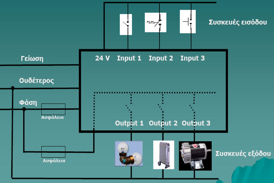 Όπωςφαίνεταιαπότοσχήμα,οιείσοδοιείναιηλεκτρικά ανεξάρτητεςαπότιςεξόδουςαφούτρφοδοτούνταιαπό διαφορετικάδίκτυα.Ημόνησύνδεσηπουυπάρχειμεταξύ εισόδωνκαιεξόδωνείναιμέσωτουπρογράμματοςτοοποίο επεξεργάζεταιταδεδομένατωνεισόδωνκαιεξάγειτα αποτελέσματα των εξόδωνΠ.χ.αντιλαμβάνεταιτηνείσοδοΙ1καιΙ2μετιμήλογικό“1” και,μεβάσητοπρόγραμμαπουέχουμεεισάγει,δίνειστην έξοδο Q1 τιμή λογικό “1”