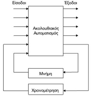 Αςθυμηθούμετηνεκκίνησηενόςκινητήρα.Ηαρχήτης λειτουργίαςαυτούτουσυστήματοςείναιγνωστή:όταν πιέσουμετοπλήκτροSTARTοκινητήραςμπαίνεισεκίνηση εφόσονείναισεστάση,ενώότανπιέσουμετοπλήκτροSTOP ο κινητήρας σταματά, εφόσον κινείται.Υποθέτουμεότιμιαδεδομένηχρονικήστιγμήγνωρίζουμε τηστιγμιαίατιμήτωνεισόδωνπ.χ.ότιδενπιέζεταικανένα απόταδύοπλήκτρατουχειριστηρίου.Οκινητήραςθα στραφεί ή θα είναι σε στάση; Ηπληροφορίααυτήδενείναιαπόμόνητηςεπαρκής,γιανα καθορίσουμεμεβεβαιότητατηνκατάστασητηςεξόδου, δηλαδήτηνκίνησητουκινητήρα.Οκινητήραςμπορεί εξίσουκαλά,ναστρέφειήναείναισεστάση.Ειδικότερα γνωρίζουμεότιχωρίςεπέμβασηστοχειριστήριοο κινητήραςθακινείται,εάνήδηστρεφότανενώθα παραμείνει σταματημένος, εάν ήταν ήδη σε στάση.Μεάλλαλόγια,αυτότοσύστημααυτοματισμούθυμάταικαι διατηρείτηνκατάστασηπουείχεπροηγουμένως,δηλαδήη έξοδοςτουεξαρτάταιαπότηνπροηγούμενηκατάστασητης εξόδου.Θαμπορούσαμεναπούμεότιένατέτοιοσύστημα αυτοματισμού διαθέτει μνήμη. Αυτόείναικαιέναγενικότεροχαρακτηριστικότων ακολουθιακώναυτοματισμών–δηλαδήότιαυτάτα συστήματαδιαθέτουνκαιεσωτερικέςμεταβλητές(μνήμες). Τοσύστημααυτοματισμούκαταχωρείτιμέςσεαυτέςτις μνήμεςκαιτιςεπαναχρησιμοποιείμαζίμετιςτιμέςτων εισόδωνγιατονυπολογισμότωντιμώντωνεξόδωντου συστήματος.