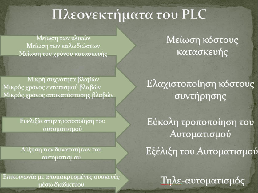 ΌτανλέμεότιταPLCέχουναντικαταστήσειτους ΗλεκτρονόμουςδενεννοούμεότιοιΗλεκτρονόμοιέχουν εκλείψειαπότηνΒιομηχανία-ταφορτίαστηβιομηχανία συνεχίζουννατροφοδοτούνταιαπόΗλεκτρονόμους.Όμως βοηθητικέςεπαφές,χρονικά,απαριθμητέςπλέον καταργούνταιαφού,ωςλειτουργίες,ενσωματώνονταιστο PLC.Αποτέλεσμαημείωσητουκόστουςπαραγωγήςκαι, συνεπώς, η μείωση της τιμής των ηλεκτρονικών συσκευών.Στοπαρακάτωπαράδειγμαβλέπουμετηνπερίπτωσηενός ανελκυστήρατεσσάρωνστάσεωνμεχρήσηκλασσικών συμβατικώνρελέκαιστησυνέχεια,τοντρόποπουαυτήη διαδικασία μπορεί να απλουστευθεί με τη χρήση PLC
