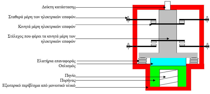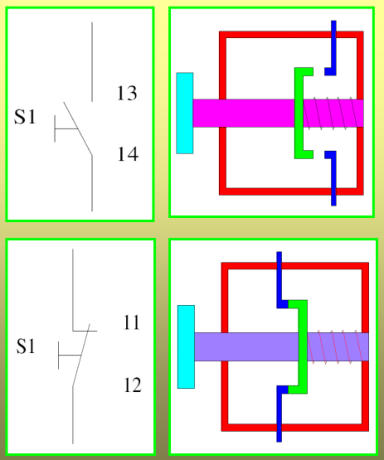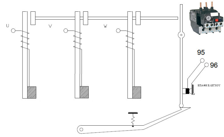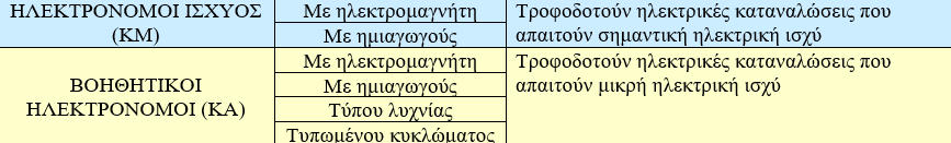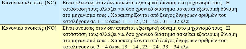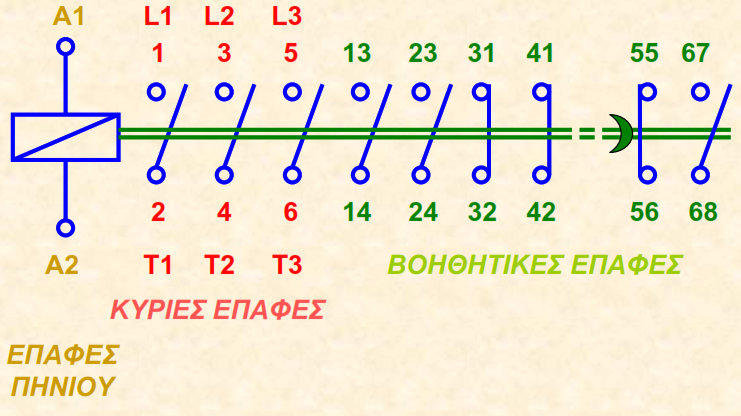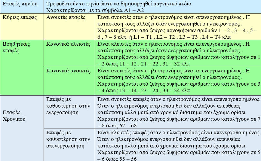 1. ΗΛΕΚΤΡΟΝΟΜΟΙ 1.1 . Χρησιμότητα Ηλεκτρονόμων Με τους ηλεκτρονόμους μπορούμε να ελέγξουμε τη ροή μεγάλων ποσοτήτων ηλεκτρικής ισχύος σε ένα ηλεκτρικό κύκλωμα χρησιμοποιώντας μια πολύ μικρή ισχύ για τη λειτουργία των ηλεκτρονόμων . Η δυνατότητα αυτή αποκτά ιδιαίτερη σημασία όταν ο χειρισμός του ηλεκτρονόμου γίνεται από απόσταση (τηλεχειρισμός ). 1. 2 . Βασικά μέρη ηλεκτρονόμου 1.3 . Λειτουργία ηλεκτρονόμων με ηλεκτρομαγνήτη Όταν το πηνίο του ηλεκτρονόμου δεν διαρρέεται από ρεύμα ο ηλεκτρονόμος είναι αποδιεγερμένος (κατάσταση ηρεμίας) . Σε αυτή την περίπτωση δεν δημιουργείται μαγνητικό πεδίο και οι επαφές του ηλεκτρονόμου βρίσκονται στην αρχική τους θέση . Αντίθετα όταν το πηνίο του ηλεκτρονόμου διαρρέεται από ρεύμα ο ηλεκτρονόμος είναι διεγερμένος (κατάσταση εργασίας) . Σε αυτή την περίπτωση δημιουργείται μαγνητικό πεδίο το οποίο έλκει τον οπλισμό του ηλεκτρονόμου και μαζί τις επαφές του με αποτέλεσμα οι ανοικτές να κλείσουν και οι κλειστές να ανοίξουν . Όταν πάψει να διαρρέεται ο ηλεκτρονόμος από ηλεκτρικό ρεύμα τότε παύει να ισχύει η μαγνητική δύναμη του μαγνητικού πεδίου με αποτέλεσμα να επανέρχεται ο οπλισμός με τις επαφές του στην αρχική του θέση. 1.4 . Κατηγορίες ηλεκτρονόμων Οι ηλεκτρονόμοι χωρίζονται σε δύο κατηγορίες ανάλογα με την χρήση τους 1.5 . Ηλεκτρικές επαφές ηλεκτρονόμων ισχύος με ηλεκτρομαγνήτη 1.6 . Συμβολισμοί Ηλεκτρονόμων 1.7 . Επιλογή Η/Ν με ηλεκτρομαγνήτη Τα χαρακτηριστικά που παίζουν ρόλο στην επιλογή του κατάλληλου ηλεκτρονόμου είναι : ονομαστική τάση τροφοδοσίας του κυκλώματος ισχύος ονομαστική τάση λειτουργίας του πηνίου είδος και πλήθος βοηθητικών επαφών ΠΡΟΣΟΧΗ : Το κύκλωμα του πηνίου του ηλεκτρονόμου είναι τελείως ανεξάρτητο από το κύκλωμα των επαφών του - δεν συνδέονται ηλεκτρικά Σημείωση : Υπάρχουν ηλεκτρονόμοι με πηνίο που λειτουργούν με συνεχές ρεύμα και ηλεκτρονόμοι με πηνίο που λειτουργεί με εναλλασσόμενο ρεύμα . Επίσης υπάρχουν ηλεκτρονόμοι διαφόρων τάσεων εφαρμογής στο πηνίο τους . Σημείωση : Οι ηλεκτρονόμοι ονομάζονται επίσης ρελαί ή τηλεχειριζόμενοι διακόπτες αέρος . 2. ΜΠΟΥΤΟΝΣ Οι χειροκίνητοι διακόπτες στιγμιαίας ενεργοποίησης (μπουτόνς) χρησιμοποιούνται στα συστήματα αυτοματισμού για τον χειρισμό μηχανημάτων .Έχουν επαφές οι οποίες αλλάζουν κατάσταση για όσο χρονικό διάστημα ασκείται εξωτερική δύναμη στο μηχανισμό τους . Οι επαφές των μπουτόνς διακρίνονται σε : Τα μπουτόνς με μια κανονικά κλειστή επαφή ονομάζονται μπουτόνς stop ενώ τα μπουτόνς με μια κανονικά ανοικτή επαφή ονομάζονται μπουτόνς start Τα μπουτόνς χαρακτηρίζονται με το γράμμα S . Οι επαφές τους έχουν σχετικά μικρή αντοχή σε ρεύμα (περίπου 5 Α) Συνήθως τα μπουτόνς χρώματος πράσινου χρησιμοποιούνται ως start ενώ τα μπουτόνς χρώματος κόκκινου χρησιμοποιούνται ως stop . 3 ΛΥΧΝΙΕΣ ΕΝΔΕΙΞΗΣ Οι ενδεικτικές λυχνίες χρησιμοποιούνται στα συστήματα αυτοματισμού για την ένδειξη της κατάστασης λειτουργίας τους . Τα πιο συνηθισμένα χρώματα ενδεικτικών λυχνιών είναι το κόκκινο και το πράσινο 4.ΘΕΡΜΙΚΑ 4.1. Γενικά Υπερφόρτιση ενός κινητήρα συμβαίνει όταν ο κινητήρας απορροφήσει από το δίκτυο τροφοδοσίας μεγαλύτερο ρεύμα από το ονομαστικό του για κάποιο χρονικό διάστημα . Αυτό μπορεί να συμβεί σε ένα κινητήρα στις ακόλουθες περιπτώσεις : Η ισχύς που απορροφάει ο κινητήρας είναι μεγαλύτερη από την ονομαστική του ισχύ . Ο κινητήρας τροφοδοτε