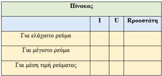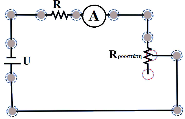 ΔΙΑΙΡΕΤΗΣ ΕΝΤΑΣΗΣ (ΜΕΤΑΒΛΗΤΟΣ) - ΡΟΟΣΤΑΤΗΣΑ. ΘΕΩΡΗΤΙΚΟ ΜΕΡΟΣΣτηνμελέτητουποτενσιομέτρουείδαμετοντρόπολειτουργίαςτηςμεταβλητήςαντίστασηςσυνδέονταςτουςδύοακίνητουςκαιτονκινητό ακροδέκτη (δρομέα) στο κύκλωμα. Με αυτό τον τρόπο πετύχαμε τη διαίρεση της τάσης εισόδου σε μικρότερες.Εάνσυνδέσουμεστοκύκλωμαμόνοτονέναακίνητοκαιτονκινητόακροδέκτητηςμεταβλητήςαντίστασηςτότεσχηματίζουμετονεπονομαζόμενο ρυθμιστήέντασηςήαλλιώςροοστάτη.Δηλαδήέναηλεκτρικόκύκλωμαμετοοποίομπορούμεναρυθμίζουμετηνέντασητηςεισόδουεντόςκάποιων ορίων.Αυτόεπιτυγχάνεταιωςεξής:Καθώςκινούμετονδρομέαηαντίστασηπουβρίσκεταιεντόςκυκλώματοςμεταβάλλεται.Σύμφωναμετοννόμοτου Ωhm η αντίσταση και το ρεύμα είναι μεγέθη αντιστρόφως ανάλογα , άρα μεταβάλλεται και το ρεύμα του κυκλώματος. Συμπέρασμα : Με την χρήση του ρυθμιστή έντασης ρυθμίζουμε το ρεύμα που θα διαρρέει το κύκλωμα . Παρατηρήσεις : 1 . Ο ροοστάτης συνδέεται σε σειρά με το κύκλωμα του οποίου θέλουμε να ρυθμίσουμε το ρεύμα .2 . Όταν η αντίσταση του ροοστάτη γίνει μηδέν τότε η ένταση του κυκλώματος γίνεται μέγιστη .3 . Όταν η αντίσταση του ροοστάτη γίνει μέγιστη τότε η ένταση του κυκλώματος γίνεται ελάχιστη .Β. ΚΥΚΛΩΜΑ ΜΕΤΡΗΣΕΩΝΓ. ΠΟΡΕΙΑ ΕΡΓΑΣΙΑΣΣυνδεσμολογήστε το κύκλωμαΜετακινήστετοδρομέατουροοστάτηκαιβρείτετηθέσηόπουτορεύμαγίνεταιελάχιστο.Καταγράψτετηνένδειξητουβολτομέτρουκαιτου αμπερομέτρου και υπολογίστε την αντίσταση του ροοστάτη .Τι παρατηρείτε στην τιμή της αντίστασης του ροοστάτη; Μετακινήστε το δρομέα του ροοστάτη και βρείτε τη θέση του δρομέα όπου το ρεύμα γίνεται μέγιστο. Καταγράψτε την ένδειξη του βολτομέτρου και του αμπερομέτρου και υπολογίστε την αντίσταση του ροοστάτη.Τι παρατηρείτε στην τιμή της αντίστασης του ροοστάτη; Υπολογίστε την μέση τιμή του μέγιστου και του ελάχιστου ρεύματος και ρυθμίστε το ροοστάτη ώστε το ρεύμα του κυκλώματος να λάβει αυτή την τιμή . Καταγράψτε την ένδειξη του βολτομέτρου και του αμπερομέτρου και υπολογίστε την αντίσταση του ροοστάτη .Μπορείτε να πραγματοποιήσετε την εργαστηριακή άσκηση στο ακόλουθο εικονικό ηλεκτρολογικό εργαστήριοΔ. ΠΙΝΑΚΑΣ ΜΕΤΡΗΣΕΩΝΕ. ΣΥΜΠΕΡΑΣΜΑΤΑΕρώτηση: Τι παρατηρείτε στην τιμή της αντίστασης του ροοστάτη όταν το ρεύμα γίνεται ελάχιστο; Ερώτηση: Τι παρατηρείτε στην τιμή της αντίστασης του ροοστάτη όταν το ρεύμα γίνεται μέγιστο;
