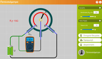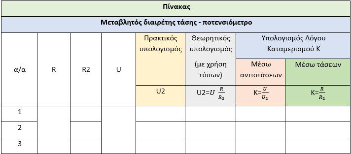 Διαιρέτης Τάσης (Μεταβλητός) - ΠοτενσιόμετροΑ. ΘΕΩΡΗΤΙΚΟ ΜΕΡΟΣΤο ποτενσιόμετρο είναι μια αντίσταση τριών ακροδεκτών που χρησιμοποιείται πολύ συχνά στην ηλεκτρολογία. Ο ένας από τους τρεις ακροδέκτες είναι μια (μεταβλητή) συρόμενη ή περιστρεφόμενη επαφή – δρομέας, που μπορεί να κινείται ελεύθερα πάνω σε μια αντίσταση. Ανάλογα με τη θέση του δρομέα μπορούμε να πάρουμε διαφορετική τάση στα άκρα του ποτενσιόμετρου (ανάμεσα σε σταθερή και μεταβλητή επαφή). Όσο ο δρομέας μετακινείται προς το άκρο της αντίστασης, τόσο μεγαλύτερη τάση μπορούμε να λάβουμε.Β. ΚΥΚΛΩΜΑ ΜΕΤΡΗΣΕΩΝΓ. ΠΟΡΕΙΑ ΕΡΓΑΣΙΑΣΜέτρηση τάσης και αντίστασης μεταξύ σταθερών ακροδεκτώνΣυνδέστε το ωμόμετρο στους σταθερούς ακροδέκτες Α και Β του ποτενσιόμετρου, μετρήστε την συνολική αντίσταση R και σημειώστε την τιμή στον πίνακαΣυνδέστε το βολτόμετρο στους σταθερούς ακροδέκτες Α και Β του ποτενσιόμετρου , τροφοδοτήστε το κύκλωμα με τάση και σημειώστε την τιμή U στον πίνακαΜέτρηση τάσης και αντίστασης μεταξύ σταθερού και κινητού ακροδέκτηΜετακινήστε το δρομέα του ποτενσιομέτρου σε μια θέση και μετρήστε με ένα βολτόμετρο την τάση U2 μεταξύ σταθερού και κινητού ακροδέκτη . Σημειώστε την τιμή στον πίνακαΑποσυνδέστε το ποτενσιόμετρο από την πηγή και μετρήστε την αντίσταση R2 μεταξύ του σταθερού και κινητού ακροδέκτηΥπολογίστε τον λόγο καταμερισμού Κ του μεταβλητού διαιρέτη από τις τιμές των αντιστάσεων R1 , R2 και από τις τις τιμές των τάσεων U , U2 .Επαναλάβετε τα βήματα 3 , 4 και 5 για δύο διαφορετικές θέσεις του κινητού ακροδέκτη .Μπορείτε να πραγματοποιήσετε την εργαστηριακή άσκηση στο ακόλουθο εικονικό ηλεκτρολογικό εργαστήριοΔ. ΠΙΝΑΚΑΣ ΜΕΤΡΗΣΕΩΝΕ. ΣΥΜΠΕΡΑΣΜΑΤΑΕρώτηση: Τι ένδειξη θα δείχνει ένα ωμόμετρο εάν το συνδέσετε στους σταθερούς ακροδέκτες ενός ποτενσιομέτρου και μετακινείτε την κινητή επαφήΕρώτηση: Τι ένδειξη θα δείχνει ένα βολτόμετρο εάν το συνδέσετε στους σταθερούς ακροδέκτες ενός ποτενσιομέτρου και μετακινείτε την κινητή επαφή