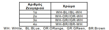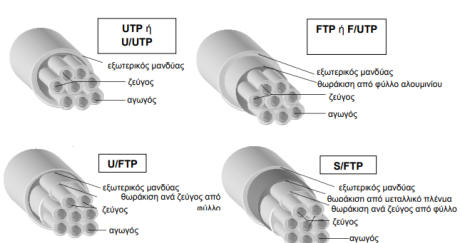 Τοκαλώδιοαυτόαποτελείταιαπότέσσεραζευγάριααγωγώνπουξεχωρίζουν μεταξύ τους μέσω ενός χρωματικού κώδικα. Οι αγωγοί του κάθε ζεύγους είναι συνεστραμένοιΟλόγοςείναιγιαναπεριορίσουντοφαινόμενοτηςΔιαφωνίαςδηλαδήτης μεταφοράς σήματος από το ένα ζευγάρι στο άλλο;Όσοπυκνότερηείναιησυστροφήτωναγωγώντόσοισχυρότερηκαταστολήτης Διαφωνίαςέχουμεκαι,άρατοΕύροςΖώνηςΔιέλευσηςΣυχνοτήτωνείναι μεγαλύτεροκαικατάσυνέπειακαιοΡυθμόςΜεταφοράςΔεδομένωνείναι μεγαλύτεροςΓιαδεδομένηκατηγορίακαλωδίου(δηλαδήγιαδεδομένορυθμόμεταφοράς δεδομένων),τοκαλώδιοείναιδυνατόννακατασκευαστείμεδιάφορουςτρόπους, ώστε να επηρεάζεται περισσότερο ή λιγότερο απο τον ηλεκτρικό θόρυβο. Αυτόςοτρόποςκατασκευήςχαρακτηρίζεταιωςηλεκτρικήθωράκισητου καλωδίουΣκοπόςέχειναπαρεμποδίζειτονεξωτερικόηλεκτρικόθόρυβοναεισέλθειστο καλώδιοΥπάρχουν οι εξής περιπτώσεις:Καλώδιο UTP (Unshielded Twisted Pair)Είναιένακαλώδιοδικτύουμεσυνεστραμμέναζεύγησυρμάτωνανάδύο.Tαζεύγη καλωδίωνδενέχουνκάποιαθωράκιση–ούτετασύρματαμεμονωμένα,ούτετα ζεύγη. Ασφαλώς, αυτό προστατεύεται εξωτερικά από περίβλημα.Καλώδιο STP (Shielded Twisted Pair)Είναικαλώδιοσυνεστραμμένωνζευγών.Εδώόμωςέχουμετηδιαφοράότιτα ζεύγηκαλωδίωνθωρακίζονταιαπόφύλλοχαλκούήάλλουμετάλλουγια προστασία.Τομεταλλικόφύλλοδενπεριβάλλειτοκάθεζεύγος,αλλάόλαμαζί. Και πάλι, το εξωτερικό του περίβλημα προστατεύει όλα τα ζεύγη.Καλώδιο FTP (Foil Twisted Pair)Κάθεσυνεστραμμένοζεύγοςθωρακίζεταιμεφύλλομετάλλου.Έπειτα,τοσύνολο τωνθωρακισμένωνζεύγωνκαλύπτειτοεξωτερικόπερίβληματουκαλωδίου.Έτσι, αυτόπροστατεύεταιαπόδιεπαφήκαιπολλάάλλαπουμπορείνα“ρίχνουν”την ποιότητα του σήματος.S/FTP καλώδια;Eχουμετημέγιστηδυνατήθωράκιση.Αυτόςοτύποςκαλωδίουσυνδυάζειτους τύπουςFTPκαιSTP.Δηλαδή,τοκάθεσυνεστραμμένοζεύγοςθωρακίζεταιμε μεταλλικόπερίβλημα.Στησυνέχειακαιπριναπότοεξωτερικόπερίβλημάτου,το σύνολοτωνζευγώνθωρακίζεταιμεέναακόμαφύλλομετάλλουήάλλουλικό. Πρόκειται για τον πιο γερά θωρακισμένο τύπο από όλους.Σημείωση:όσομεγαλύτερηείναιηθωράκισητουκαλωδίου,τόσοπιογρήγορη καισταθερήείναιησύνδεσηστοδίκτυό..Επίσης,τόσοπιοπροστατευμένοείναι τοίδιοτοκαλώδιοαπόφθορές.Ανάλογατηνχρήσητουκαιτοχώροστονοποίο βρίσκεται,μπορείναέρχεταισεεπαφήμεδιάφοραυλικάταοποίανατο φθείρουν.Ωστόσοόσομεγαλύτερηείναιηθωράκιση,τουκαλωδίουτόσοπιοδύσκαμπτο γίνεται
