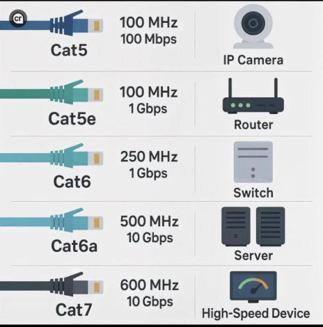 Cat5e: Χρησιμοποιείται για τη μετάδοση σήματος υψηλής πιστότητας μεταξύ ηλεκτρονικών συσκευών και συσκευών τηλεπικοινωνίας. Χρησιμοποιείται κυρίως στη δομημένη καλωδίωση δικτύων υπολογιστών τύπου Ethernet. Λειτουργούν στις συχνότητες μέχρι 100 MHz και παράσχουν μέχρι 1 Gbit/s εύρος ζώνης.Cat6:Χρησιμοποιείταιειδικάγιατηνσύνδεσηηλεκτρονικώνυπολογιστώνκαι συγκεκριμέναγιατηνκαλωδίωσηδικτύωνGigabitEthernet.ΤακαλώδιαCat6 είναισυμβατάμετακαλώδιαCat5e,παρέχουνόμωςυψηλότερηηλεκτρική πιστότητακαιλιγότερεςηλεκτρονικέςπαρεμβολέςσεσύγκρισημεαυτά. Λειτουργούνστιςσυχνότητεςμέχρι250MHzκαιπαράσχουνμέχρι1Gbit/s εύρος ζώνης.Cat6A: Βελτιωμένη έκδοση των καλωδίων Cat6 η οποία προορίζεται για καλώδια που θα λειτουργούν στις συχνότητες μέχρι 500 MHz, θα παράσχουν μέχρι 10 Gbit/s εύρος ζώνης και θα έχουν μέγιστο μήκος 100 μέτρων.Cat7: Χρησιμοποιείται ειδικά όπου απαιτείτε υψηλής ταχύτητας σύνδεση μεταξύ συσκευών και συγκεκριμένα για την καλωδίωση δικτύων 10 Gigabit Ethernet. Τα καλώδια Cat7 παρέχουν υψηλότερη ηλεκτρική πιστότητα και λιγότερες ηλεκτρονικές παρεμβολές σε σύγκριση με τα καλώδια Cat6, ενώ είναι συμβατά τόσο με τα καλώδια Cat6 και με τα Cat5e. Για να συμβεί αυτό, υπάρχει πρόσθετη θωράκιση για κάθε ζεύγος εσωτερικών καλωδίων και για το καλώδιο συνολικά. Λειτουργούν στις συχνότητες μέχρι 600 MHz και παράσχουν μέχρι 10 Gbit/s εύρος ζώνης.