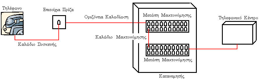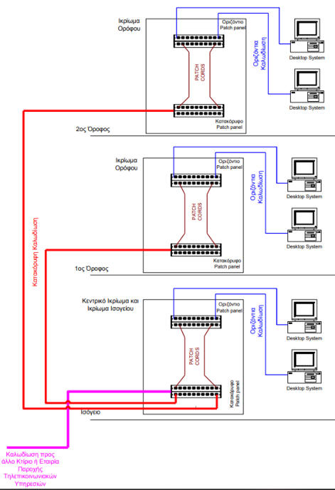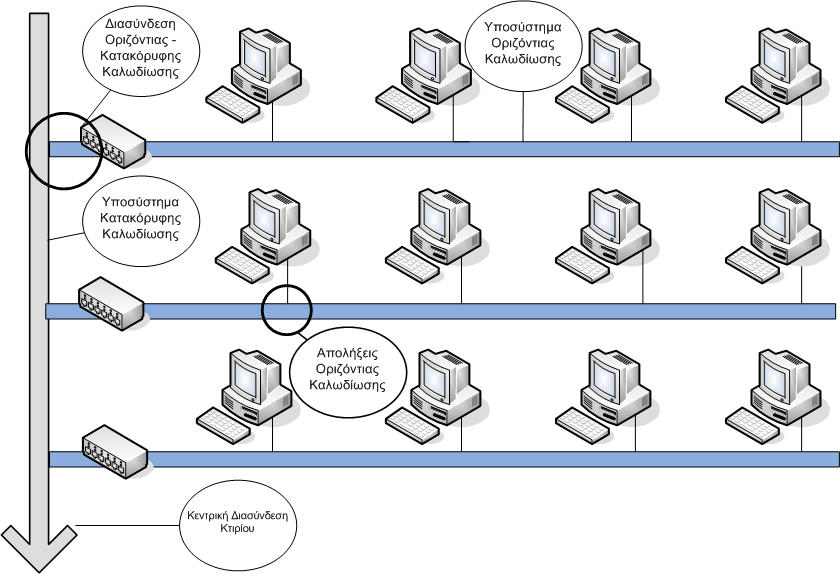 Οριζόντιακαλωδίωση:τοσύστημακαλωδίωσηςπουείναιεγκατεστημένοσ’ένα όροφο–επίπεδο,τοοποίοπεριλαμβάνειτοσημείοσυγκέντρωσης(portήpatch panel)καιόλοτοκομμάτιτηςκαλωδίωσης,ηοποίαεξυπηρετείτιςθέσεις εργασίας στο συγκεκριμένο επίπεδο.