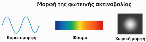 Η«μορφήτηςφωτεινήςακτινοβολίας»μπορείναεννοηθείμεδιάφορους τρόπους,ανάλογαμετοανμιλάμεφυσικά/φυσικοχημικάή οπτικά/φωτοτεχνικά.Θατηνεξηγήσουμεσετρίαεπίπεδα,απόπιοθεμελιώδεςπροςπιο εφαρμοσμένο:1. Στη φυσική – Ηλεκτρομαγνητικό κύμαΤο φως είναι μορφή ηλεκτρομαγνητικής ακτινοβολίας.Μπορείναπεριγραφείωςκύμα(συνεχέςηλεκτρικόκαιμαγνητικόπεδίοπου ταλαντώνεται κάθετα μεταξύ τους και κάθετα στη διεύθυνση διάδοσης).Μπορεί επίσης να περιγραφεί σωματιδιακά με φωτόνια (κβάντα ενέργειας).Η«μορφή»εδώσχετίζεταιμετομήκοςκύματος(ήσυχνότητα),πουκαθορίζει το χρώμα στο ορατό φάσμα.2. Ως κατανομή ενέργειας – Φασματική μορφήΗφωτεινήακτινοβολίαέχειφασματικήκατανομή:πόσηισχύςυπάρχεισεκάθε μήκος κύματος.Ημορφήαυτήμπορείναείναιστενή(μονόχρωμη,π.χ.λέιζερ)ήευρεία (πολύχρωμη, π.χ. ήλιος).Επίσηςμπορείναέχειπολικότητα(π.χ.πολωμένοφως)καιχρονικήδομή (συνεχές ή παλμικό).3. Στην οπτική τεχνολογία – Χωρική μορφήΣτηνοπτική,η«μορφή»μπορείνασημαίνεικατανομήέντασηςστοχώρο(beam profile).Π.χ.μιαδέσμηλέιζερμπορείναείναιGaussιανή(κυκλικάσυμμετρική,μέγιστο στο κέντρο), ή ομοιόμορφη, ή με δακτυλίους.Ημορφήκαθορίζεταιαπότοντρόποπαραγωγήςκαιδιάδοσης(οπτικά στοιχεία, εμπόδια, περίθλαση).Συνοπτικά:Η «μορφή» της φωτεινής ακτινοβολίας μπορεί να περιγράφει:Την κυματομορφή της (φυσική περιγραφή).Την κατανομή στο φάσμα (χρωματική σύνθεση).Την κατανομή στο χώρο (σχήμα δέσμης ή φωτεινού πεδίου).