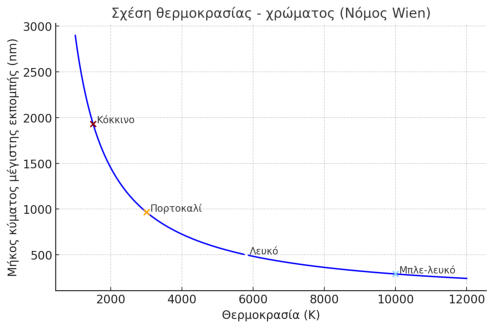 Ησχέσηθερμοκρασίαςκαιχρώματοςείναιβασικήστηνφυσικήτης ακτινοβολίαςκαισυναντάταισεφαινόμεναόπωςηλάμψηενόςθερμαινόμενου σώματος.1. Η αρχήΈνααντικείμενοπουθερμαίνεταιεκπέμπειηλεκτρομαγνητικήακτινοβολίαλόγω της θερμικής του ενέργειας.Ηθερμοκρασίακαθορίζειτοφάσματηςακτινοβολίας,άρακαιτοκυρίαρχο χρώμα.Τοφαινόμενοπεριγράφεταιαπότηθεωρίατουμέλανοςσώματος(blackbody radiation).2. Νόμος μετατόπισης του WienΔίνειτησχέσημεταξύθερμοκρασίας(Τ)καιτουμήκουςκύματοςλ_maxστο οποίο η ακτινοβολία έχει τη μέγιστη ένταση:λmax=T/bόπου b ≈ 2,898×10−3 m\cdotpKΌσοαυξάνεταιηθερμοκρασία,τομέγιστοτουφάσματοςμετατοπίζεταιπρος μικρότερα μήκη κύματος (δηλαδή από το κόκκινο προς το μπλε).3. Πρακτικά παραδείγματαΘερμοκρασία (K)Κυρίαρχο ΧρώμαΠαράδειγμα~1 000–2 000 -->Βαθύ κόκκινο -->Θερμή αντίσταση σόμπας~3 000 -->Κοκκινοπορτοκαλί-->Λάμπα πυράκτωσης~5 800- -> Λευκοκίτρινο-->Ήλιος~10 000+ -->Μπλε-λευκό-->Αστέρες τύπου O4. Σημείωση για το “χρώμα θερμοκρασίας”Στηνφωτογραφίακαιφωτισμό,ηθερμοκρασίαχρώματος(σεKelvin)είναιμια μέτρησηπουπεριγράφειτοαντοφωςφαίνεται«θερμό»(κιτρινωπό)ή«ψυχρό» (μπλε).Δενείναιηπραγματικήθερμοκρασίατουαντικειμένου,αλλάηθερμοκρασία μέλανος σώματος που θα εξέπεμπε παρόμοιο φως.