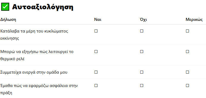 Σκοπός της ΆσκησηςΝακατανοήσουνοιμαθητέςτηλειτουργίακαιτη συνδεσμολογίαεκκίνησηςενόςμονοφασικούκινητήρα μέσωτηςδιερεύνησηςκαιτηςπρακτικήςεπίλυσηςενός ρεαλιστικού προβλήματος.Στοτέλοςαυτήςτηςάσκησηςοιμαθητέςθαείναισεθέση να:1.αναγνωρίζουνκαιναεπιλέγουντακατάλληλαυλικά για την εκκίνηση μονοφασικού κινητήρα .2.πραγματοποιούνσυνδέσειςμεταξύτωνδιαφόρωνυλικών για την πραγματοποίηση της άσκησης . 3.συνδέουνμεδιάφορουςτρόπουςτοτριφασικό θερμικό σε μονοφασικό ηλεκτροκινητήρα 4.ρυθμίζουν το θερμικό στη σωστή ένταση ρεύματος