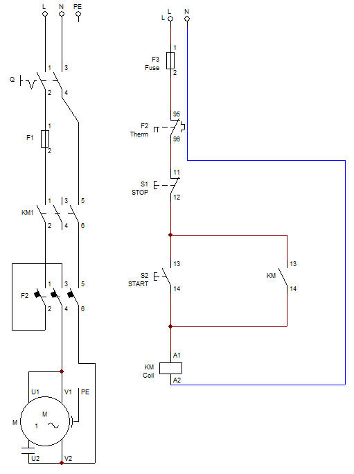 Τίτλος Άσκησης: Εκκίνηση Μονοφασικού ΚινητήραΠρόβλημα:Επιθυμούμετηνεκκίνησηενόςασύγχρονουμονοφασικούκινητήραβραχυκυκλωμένουδρομέα.Μιατέτοιαλειτουργίασυναντάται σε όλες τις οικιακές συσκευές που περιέχουν κινητήρα.Θαπρέπειναπροσέξουμεότιτοθερμικόμαςείναιτριφασικόενώοκινητήραςμονοφασικός.Συνεπώςθαπρέπειναυπάρξεικάποιοςιδιαίτερος τρόπος συνδεσμολογίας του τριφασικού θερμικού στον μονοφασικό κινητήραΣενάριο:Έναςτεχνίτηςξυλουργόςζητάναεγκαταστήσειένανμονοφασικόκινητήραγιατοξυλουργικότουμηχάνημα.Οκινητήραςθαπρέπεινα εκκινείμέσωμπουτόν(Start–Stop)καιναπροστατεύεταιαπόυπερθέρμανση.Οίδιοςδενγνωρίζειαπόηλεκτρολογικά,αλλάθέλειοκινητήρας να ξεκινά εύκολα και με ασφάλεια.Εφαρμογές Εκκίνησης Μονοφασικού ΚινητήραΟικιακές εφαρμογέςΠλυντήρια ρούχων – Κινούν τον κάδο πλύσης.Κλιματιστικά – Για τον ανεμιστήρα και το συμπιεστή.Ψυγεία / Καταψύκτες – Κινούν τον συμπιεστή του ψυκτικού κύκλου.Ανεμιστήρες / Εξαεριστήρες – Μικρής έως μεσαίας ισχύος.Αποχυμωτές / Μίξερ / Μπλέντερ – Μικροί επαγωγικοί ή συλλεκτικοί κινητήρες.Μικρές επαγγελματικές και εργαστηριακές εφαρμογέςΠάγκοι εργαστηρίου – Μοτέρ σε τροχούς λείανσης ή φρέζες.Ηλεκτρικές αντλίες νερού – Για αρδευτικά, βρύσες ή σιντριβάνια.Ηλεκτρικές πρέσες / Μηχανές κοπής – Σε ελαφρές εργασίες.Μηχανήματα ξυλουργείου – Π.χ. δράπανα, σβούρες, μικροφρέζες.Φυσητήρες αέρα – Για απαγωγή καπνού ή σκόνης.Αγροτικές εφαρμογέςΑντλίες ποτίσματος – Όπου υπάρχει μόνο μονοφασική παροχή.Μικρά τρακτέρ ή μηχανές επεξεργασίας τροφίμων – Για μεταποίηση σε μικρές μονάδες.Μηχανές αλέσεως / κοπής ζωοτροφών.Επαγγελματικοί χώροι – Υποστήριξη κτιριακών συστημάτωνΣυστήματα αυτόματου ανοίγματος πορτών / ρολών – Με απλό μονοφασικό μοτέρ.Ανελκυστήρες μικρής ισχύος – Σε παλιά κτίρια χωρίς τριφασική παροχή.Συστήματα εξαερισμού σε τουαλέτες ή αποθήκες.ΣύνδεσημετηνπροηγούμενηΆσκηση:Ηεκκίνησηενόςμονοφασικούκινητήραδιαφέρειωςπροςτοκύκλωμααυτοματισμούστοκύκλωμα ισχύοςσεσχέσημετοαντίστοιχοκύκλωμαεκκίνησηςτριφασικούκινητήρα.ΑυτόπουδιαφοροποιείταιείναιτοκύκλωμαΙσχύος.Αυτήη διαφοροποίηση οφείλεται στο γεγονός ότι πλέον έχουμε μονοφασικό κινητήρα ο οποίος θα πρέπει να τροφοδοτηθεί από μονοφασικό δίκτυο.Λίγαλόγιαγιατονασύγχρονομονοφασικόκινητήρα:Γιαναμπορέσειναδημιουργήσειοασύγχρονοςμονοφασικόςκινητήραςροπή εκκίνησηςώστεναπεριστραφείαπαιτείται,εκτόςαπότοκύριοτύλιγματουστάτητου,καιέναβοηθητικότύλιγμα-βοηθητικήδιάταξη εκκίνησης.Άρα,ουσιαστικά,οστάτηςτουπεριέχειδύοτυλίγματα–τοκύριοκαιτοβοηθητικό-ταοποίασυνδέονταιμεταξύτουςπαράλληλακαι τροφοδοτούνταιαπότομονοφασικόδίκτυο.Τοκύριο(V1-V2)έχειδιαφορετικήσύνθετηαντίστασηαπότοβοηθητικό(U1-U2)καισυνεπώςτα αντίστοιχαρεύματατουςβρίσκονταισεδιαφοράφάσης.Αυτόέχειωςαποτέλεσματηδημιουργίαστρεφόμενουμαγνητικούπεδίου,απαραίτητογια τη λειτουργία του κινητήρα.Οιασύγχρονοιμονοφασικοίκινητήρεςχρησιμοποιούνταικατάκόρονσεσυσκευέςοικιακήςχρήσης(ψυγεία,πλυντήριακ.λ.πκαιλιγότεροσε βιομηχανικέςεφαρμογές(προτιμούνταιοιτριφασικοίκινητήρες).Περισσότερεςλεπτομέρειεςγιατουςασύγχρονουςμονοφασικούςκινητήρεςθα μάθουμε στο πέμπτο κεφάλαιο του μαθήματος των Ηλεκτρικών Μηχανών, το οποίο ασχολείται με τους μονοφασικούς κινητήρεςΚαθοδηγητικές Ερωτήσεις (Διερεύνηση)Ποιοι είναι οι βασικοί κίνδυνοι κατ