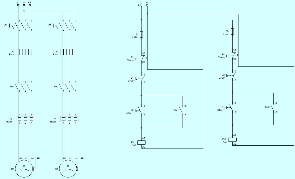 Πρόβλημα: θέλουμε να κατασκευάσουμε ένα κύκλωμα αυτοματισμού που να ελέγχει τη λειτουργία δυο τριφασικών κινητήρων. Οι δυο κινητήρες θα μπορούν να