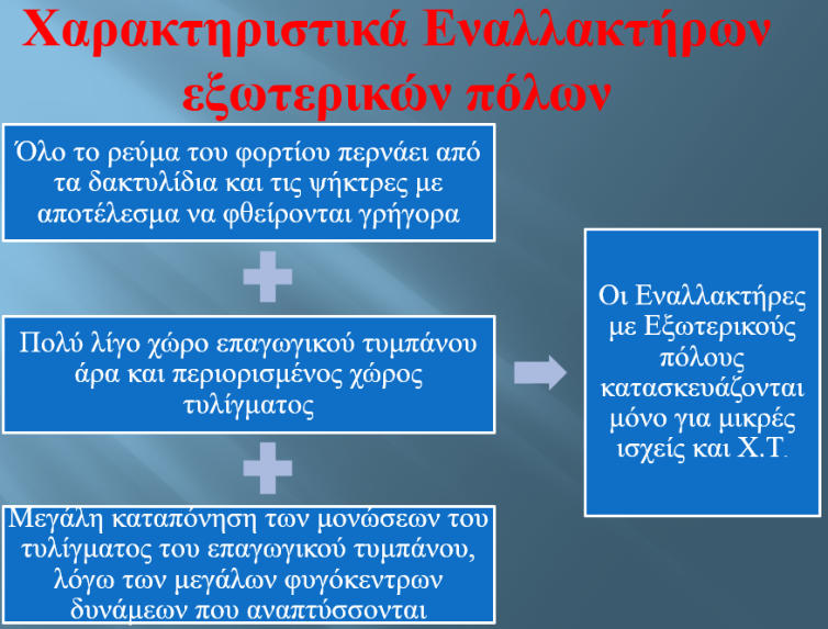 Ηέκφραση"μεεξωτερικούςπόλους"αναφέρεταισεεναλλακτήρες στους οποίους:Οιπόλοιτουμαγνητικούπεδίου(δηλ.οιδιεγέρτες)είναι τοποθετημένοι στον στάτη (στο σταθερό μέρος).Τοτύλιγματουεπαγωγικούτυμπάνουείναιτοποθετημένοστονδρομέα (κινητόμέρος)καιπεριστρέφεται,παράγονταςτοεναλλασσόμενο ρεύμα.