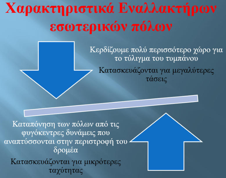 Ηέκφραση"μεεσωτερικούςπόλους"αναφέρεταισεεναλλακτήρες στους οποίους:Οιπόλοιτουμαγνητικούπεδίου(δηλ.οιδιεγέρτες)είναι τοποθετημένοι στον δρομέα (στο κινητό μέρος).Τοτύλιγματουεπαγωγικούτυμπάνουείναιτοποθετημένοστονστάτη και είναι ακίνητο, παράγοντας το εναλλασσόμενο ρεύμα.