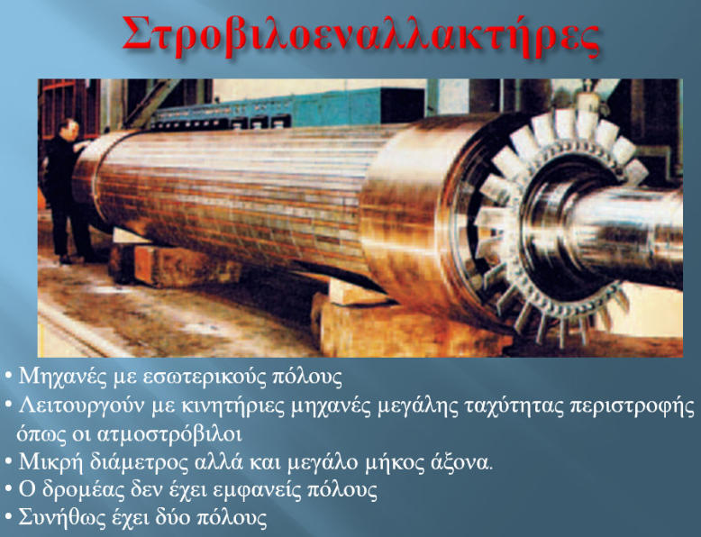 ΟΣτροβιλοεναλλακτήραςαποτελείτην"καρδιά"ενόςσταθμού παραγωγής ενέργειαςΧαρακτηριστικά ΣτροβιλοεναλλακτήραΤύπος: Σύγχρονος εναλλακτήραςΔρομέας: Μακρύς, κυλινδρικός και ομαλός (τύπου "drum")Στάτης: Περιλαμβάνει τα επαγωγικά τυλίγματαΨύξη: Με αέρα, υδρογόνο ή ακόμα και νερό (σε πολύ ισχυρές μονάδες)Τάση εξόδου: Π.χ. 10–25 kV (πριν μετασχηματιστεί για μεταφορά)Ισχύς: Από δεκάδες έως και εκατοντάδες MWΠλεονεκτήματαΠολύ υψηλή απόδοση (~98%)Ανθεκτικότητα σε υψηλές ταχύτητεςΣυνεχής και αξιόπιστη παραγωγή ισχύοςΠροσοχήΟιστροβιλοεναλλακτήρεςπρέπειναπεριστρέφονταιμεσυγκεκριμένες ταχύτητες,ανάλογατοναριθμότωνπόλωντους,ώστενασυνδεθούν σωστάκαινασυγχρονιστούνμετοδίκτυο(π.χ.3000rpmγια50Hz,2 πόλοι),