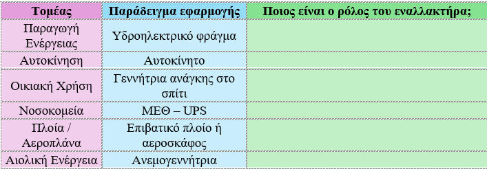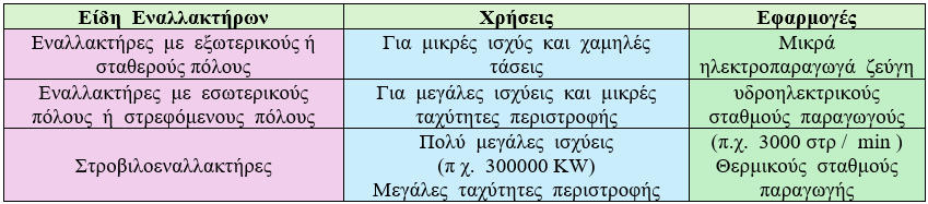 1. ΕισαγωγήΚατάτηνδιάκρισητωνηλεκτρικώνμηχανώναναφερθήκαμεστιςηλεκτρικέςμηχανέςεναλλασσόμενουρεύματοςοιοποίεςλειτουργούνμετηνμετατροπήεναλλασσόμενηςηλεκτρικήςενέργειαςσεμηχανικήενέργεια(περίπτωσηκινητήρα)καιτηνμηχανική ενέργεια σε εναλλασσόμενη ηλεκτρική ενέργεια (περίπτωση γεννήτριας) .Καταλήγουμε λοιπόν ότι οι ηλεκτρικές μηχανές Ε.Ρ. ουσιαστικά διακρίνονται σε δύο μεγάλες κατηγορίες :1.Σύγχρονες: υπάρχει ορισμένη σταθερή σχέση ανάμεσα στην ταχύτητα περιστροφής και στην συχνότητα του ρεύματος 2. Ασύγχρονες: η ταχύτητα περιστροφής για μια ορισμένη συχνότητα του ρεύματος εξαρτάται από το φορτίο .Σημείωση: οι στροβιλοεναλλακτήρες αποτελούν ειδική κατηγορία εναλλακτήρων με εσωτερικούς πόλους.Τόσοστιςσύγχρονεςμηχανέςόσοκαιστιςασύγχρονεςισχύειηαντιστρεψιμότητα.Δηλαδή,όπωςείχαμεαναφέρεικαιστιςηλεκτρικέςμηχανέςΣ.Ρ.,μπορούνναλειτουργήσουνείτεωςγεννήτριεςείτεωςκινητήρες.Περισσότεροσυχνήείναιηχρήσητης σύγχρονης μηχανής ως γεννήτρια Ε.Ρ. ή , αλλιώς, εναλλακτήρας .Οι βασικότερες χρήσεις των εναλλακτήρων είναι :•στους σταθμούς παραγωγής ηλεκτρικής ενέργειας .•σε εφεδρικά ηλεκτροπαραγωγά ζεύγη για εργοστάσια , νοσοκομεία κτλ .Σπανιότερα χρησιμοποιείται η σύγχρονη μηχανή που λειτουργεί ως κινητήρας και ονομάζεται σύγχρονος κινητήρας .Χρήση ΕναλλακτήρωνΟιεναλλακτήρες(γεννήτριεςεναλλασσόμενουρεύματος–AC)έχουνπολύευρείαχρήσησεπλήθοςεφαρμογών,απότην καθημερινότητα μέχρι τη βιομηχανία και την παραγωγή ηλεκτρικής ενέργειας.1. Παραγωγή Ηλεκτρικής ΕνέργειαςΟι εναλλακτήρες είναι η καρδιά των σταθμών παραγωγής ρεύματος, μετατρέποντας μηχανική ενέργεια σε ηλεκτρική.Παραδείγματα:Υδροηλεκτρικοί σταθμοί (με υδροστρόβιλους)Θερμοηλεκτρικοί σταθμοί (με ατμοστρόβιλους)Πυρηνικοί σταθμοίΣταθμοί με αεριοστρόβιλουςΣταθμοί παραγωγής από βιομάζα ή γεωθερμίαΑιολικά πάρκα (εναλλακτήρες ενσωματωμένοι σε ανεμογεννήτριες)2. Αυτοκίνητα και ΟχήματαΟιεναλλακτήρεςαυτοκινήτων(automotivealternators)χρησιμοποιούνταιγιατηντροφοδοσίατωνηλεκτρικώνκυκλωμάτωντου οχήματος και τη φόρτιση της μπαταρίας.Χαρακτηριστικά:Παράγουν AC, αλλά το μετατρέπουν σε DC (μέσω ανορθωτή)Κινούνται από τον κινητήρα του αυτοκινήτου μέσω ιμάντα3. Βιομηχανία & ΕργοστάσιαΟι εναλλακτήρες χρησιμοποιούνται σε γεννήτριες εφεδρείας, μηχανές παραγωγής και συστήματα UPS.Εφαρμογές:Εφεδρική τροφοδοσία σε εργοστάσιαΓεννήτριες για κρίσιμα φορτίαΣυνδυασμένα συστήματα με κινητήρες diesel ή φυσικού αερίου4. Οικιακή και Εμπορική ΧρήσηΣε περιπτώσεις διακοπής ρεύματος, χρησιμοποιούνται φορητές γεννήτριες με εναλλακτήρες.Ενδεικτικά:Γεννήτριες για σπίτια και μικρές επιχειρήσειςΓεννήτριες για κατασκηνώσεις, τροχόσπιτα κ.λπ.5. Νοσοκομεία – Κρίσιμες ΥποδομέςΟι εναλλακτήρες είναι μέρος συστημάτων αδιάλειπτης παροχής ρεύματος (UPS) και γεννητριών ανάγκης.Χρήσεις:Λειτουργία χειρουργείων και ΜΕΘΤροφοδοσία κρίσιμου ιατρικού εξοπλισμού6. Αεροπλάνα, Πλοία & ΤρέναΟι εναλλακτήρες χρησιμοποιούνται για την ηλεκτρική ισχύ του συστήματος ή την προώθηση.Παραδείγματα:Στροβιλοεναλλακτήρες σε πλοία (π.χ. πολεμικά ή μεγάλα επιβατικά)Γεννήτριες σε αεροσκάφη για ηλεκτρικά κυκλώματαΤροφοδοσία ηλεκτρονικών συστημάτων σε τρένα7. Ανανεώσιμες Πηγές ΕνέργειαςΟιανεμογεννήτριεςκαιορισμένεςφωτοβολταϊκέςδιατάξειςπεριέχουνεναλλακτήρεςήσυστήματαπουβασίζονταισεαυτούςγιατη μετα