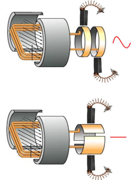 Συλλέκτης vs Δακτύλιοι ΟλίσθησηςΓεννήτρια DC:Έχεισυλλέκτη(commutator):Είναιέναςπεριστρεφόμενοςκύλινδρος από μονωμένα μεταλλικά τμήματα.Μετατρέπει το επαγόμενο AC στον δρομέα σε DC στην έξοδο.Εναλλακτήρας AC:Έχειδακτυλίουςολίσθησης(sliprings):Απλοί,κυκλικοί,μεταλλικοί δακτύλιοιπουμεταφέρουνστηνέξοδοτοACρεύμαπουπαράγεταιστη μηχανή.