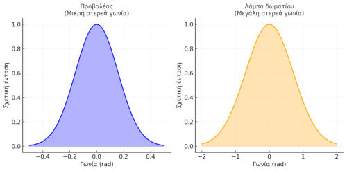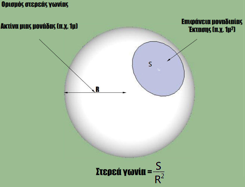 Στερεά ΓωνίαΈστωμιασφαίραακτίναςRαπότοκέντροτιςοποίαςξεκινάδέσμηακτινοβολίαςπουφωτίζειένατυχαίοτμήμα Sτηςεσωτερικήςτηςεπιφάνειας.ΟρίζεταιωςστερεάγωνίαΩτοπηλίκοτουεμβαδούSπροςτοτετράγωνοτης ακτίνας. Δηλαδή:Έχει ως μονάδα μέτρησης το στερακτίνιο sr (sterad)Ερώτηση: Πόση είναι η στερεά γωνία που ορίζεται από ολόκληρη τη σφαίρα;Εφαρμογές της Στερεάς ΓωνίαςΗστερεάγωνίαέχειπολλέςπρακτικέςεφαρμογές,ιδιαίτεραστηφωτιστικήτεχνολογίααλλάκαισεάλλες επιστήμες. Ας δούμε μερικές σημαντικές:Στη Φωτιστική ΤεχνολογίαΦωτεινή ένταση (candela):Ορίζεται ως το φως που εκπέμπει μια πηγή σε μία μονάδα στερεάς γωνίας.Έτσι, η στερεά γωνία συνδέει την ποσότητα φωτός με την κατανομή του στον χώρο.Φωτιστικά σώματα (προβολείς, σποτ, λάμπες):Η διαφορά ανάμεσα σε έναν προβολέα και μια λάμπα δωματίου εξηγείται από το μέγεθος της στερεάς γωνίας.Προβολέας --> μικρή στερεά γωνία, συγκεντρωμένο φως.Λάμπα --> μεγάλη στερεά γωνία, διάχυτο φως.Σχεδιασμός φωτισμού σε χώρους:Οιαρχιτέκτονεςφωτισμούχρησιμοποιούντηστερεάγωνίαγιανακαθορίσουνπώςκατανέμεταιτοφωςσεέναν χώρο (π.χ. πόσο ομοιόμορφος θα είναι ο φωτισμός σε μια αίθουσα).Στις Επικοινωνίες & ΤηλεπικοινωνίεςΚεραίες ραδιοκυμάτων και δορυφορικές κεραίες:Η στερεά γωνία χρησιμοποιείται για τον προσδιορισμό του διαγράμματος ακτινοβολίας μιας κεραίας.Κεραία με μικρή στερεά γωνία --> συγκεντρώνει ενέργεια σε μια κατεύθυνση (καλύτερη εμβέλεια).Στη ΦυσικήΑκτινοβολία και φωτεινή ροή:ΟυπολογισμόςτηςενέργειαςπουφτάνεισεμιαεπιφάνειααπότονΉλιοήάλλεςπηγέςγίνεταιμέσωτης στερεάς γωνίας που “βλέπει” την πηγή.Αστρονομία:Τα τηλεσκόπια «συλλέγουν» φως από αστέρες μέσα σε μια στερεά γωνία.Μεγαλύτερη στερεά γωνία --> περισσότερο φως, μικρότερη λεπτομέρεια.Στην Οπτική & ΑπεικόνισηΦακοί και κάμερες:Το οπτικό πεδίο μιας κάμερας εκφράζεται ως στερεά γωνία.Ευρυγώνιοι φακοί --> μεγάλη στερεά γωνία.Τηλεφακοί --> μικρή στερεά γωνία.Ένταση φωτεινής πηγήςΕίναι το συνολικό ποσό ορατής ακτινοβολίας που εκπέμπει μια πηγή προς μια ορισμένη κατεύθυνση.Μιαφωτεινήπηγήδενεκπέμπειομοιόμορφατοφωςπουπαράγει.Δηλαδήανηπηγήτοποθετηθείστοκέντρο σφαίρας,ηφωτεινήροήΦπουθαεκπέμπεταιπροςτηνεσωτερικήεπιφάνειατηςσφαίραςδενθαείναιηίδιασε κάθεσημείοαυτής.ΓιαπαράδειγμασεέναλαμπτήραπυράκτωσηςηφωτεινήροήΦ1πουεκπέμπεταισεμια στερεάγωνίαω1προςταπλάγιατουλαμπτήραείναιπολύμικρότερηαπότηνφωτεινήροήΦ2πουεκπέμπεται σε μια στερεά γωνία ω2=ω1 προς τα κάτωΕίναι επομένως χρήσιμο να οριστεί ένα διανυσματικό μέγεθος που θα καθορίζει προς κάθε συγκεκριμένη κατεύθυνση του στερεού χώρου το ποσό της Φωτεινής Έντασης (Luminous Intensity) ή Ένταση Φωτεινής Πηγής Ι.Η Φωτεινή ένταση ορίζεται ως ο λόγος της στοιχειώδους Φωτεινής Ροής dΦ που εκπέμπει μια φωτεινή πηγή μέσα σε μια στοιχειώδη στερεά γωνία dω, προς τη γωνία αυτή: Η Φωτεινή Ένταση Ι εκφράζεται με τη μονάδα cd (candela) για την οποία ισχύει:Cd=lm/sr (candela=lumen/sterad)Από τον ορισμό αυτό φαίνεται ότι η Φωτεινή Ένταση Ι έχει τις ίδιες διαστάσεις με την Φωτεινή Ροή Φ γιατί το στερακτίνιο είναι αδιάστατο μέγεθος. Επομένως η μονάδα cd έχει τις ίδιες διαστάσεις με τη μονάδα lm.Η φωτομετρική καμπύλη ή πολικό διάγραμμα μας δείχνει την κατανομή της έντασης φωτισμού στο χώρο, πως διαχέεται το φως στο χώρο ,δηλαδή την ποσότητα της φωτεινής ροής που ακτινοβολεί προς μια ορισμένη κατεύθυνση με μονάδα μέτρησης candela (cd) και 