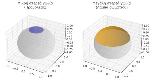 Ηστερεάγωνία(solidangle)είναιμιαέννοιαπουχρησιμοποιείταικυρίωςστηγεωμετρία,στη φυσική και στη φωτιστική τεχνολογία. Είναι το τρισδιάστατο ανάλογο της επίπεδης γωνίας.Γιατι μας ενδιαφέρει η στερεά γωνία στην φωτιστική τεχνολογία;Αποτελείκεντρικήέννοιαστηφωτιστικήτεχνολογίαγιατίμαςεπιτρέπειναπεριγράψουμεπώς κατανέμεταιτοφωςστονχώρο.Δενμαςαρκείναξέρουμεπόσαlumen(συνολικήφωτεινήροή) παράγει μια πηγή· πρέπει να ξέρουμε και προς τα πού κατευθύνεται το φως.Χωρίς τη στερεά γωνία, δεν θα μπορούσαμε να μετρήσουμε πόσο "συγκεντρωμένο" είναι το φως προς μια κατεύθυνση.Σχεδιασμός φωτιστικών σωμάτωνΈνα φωτιστικό μπορεί να έχει ίδια φωτεινή ροή (lumen) με ένα άλλο, αλλά διαφορετική κατανομή φωτεινής έντασης (cd) ανά στερεά γωνία.Παράδειγμα: ένας προβολέας συγκεντρώνει το φως σε μικρή στερεά γωνία → υψηλή ένταση.Μια λάμπα γενικού φωτισμού διαχέει το φως σε μεγάλη στερεά γωνία → χαμηλότερη ένταση ανά κατεύθυνση.Υπολογισμός φωτισμού (lux)Ο φωτισμός πάνω σε μια επιφάνεια εξαρτάται από την ένταση της πηγής και τη στερεά γωνία υπό την οποία φαίνεται η επιφάνειαΈτσι μπορούμε να ξέρουμε πόσα lux φτάνουν σε ένα γραφείο, έναν δρόμο ή μια αίθουσα.Αποδοτικότητα και άνεσηΣχεδιάζοντας τη στερεά γωνία εκπομπής, εξασφαλίζουμε:ότι ο φωτισμός είναι αρκετός,δεν υπάρχει θάμβωση (glare),και η ενέργεια χρησιμοποιείται αποδοτικά (να μην φωτίζουμε «άσκοπα»).Με λίγα λόγιαΗ στερεά γωνία μας ενδιαφέρει στη φωτιστική τεχνολογία γιατί συνδέει τη φωτεινή ροή με την κατεύθυνση του φωτός, επιτρέποντας τον ακριβή σχεδιασμό, τη μέτρηση και την αξιολόγηση συστημάτων φωτισμού.Στααριστεράβλέπειςτονπροβολέα:τοφωςσυγκεντρώνεταισεμικρήστερεάγωνία-->υψηλή ένταση σε μια κατεύθυνση.Σταδεξιάτηλάμπαδωματίου:τοφωςδιαχέεταισεμεγάληστερεάγωνία-->μικρότερηένταση αλλά φωτίζει μεγάλο χώρο.Στααριστεράφαίνεταιημικρήστερεάγωνία(σανκώνος)πουαντιστοιχείσεένανπροβολέα-->συγκεντρωμένο φως.Στα δεξιά η μεγάλη στερεά γωνία --> η λάμπα δωματίου που φωτίζει διάχυτα μεγάλο χώρο.