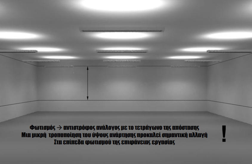 Οι επιτρεπόμενες μέγιστες διαφορές λαμπρότητας για το φωτισμό εσωτερικού χώρου είναι:μεταξύ επιφάνειας εργασίας και κοντινού περιβάλλοντος <=10:3μεταξύ επιφάνειας εργασίας και μακρινού περιβάλλοντος <=10:1