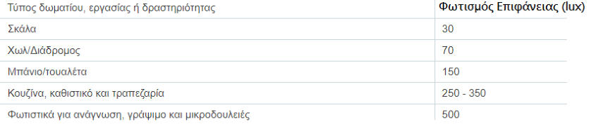 Ημελέτηφωτισμούεπιδιώκειτηνεπίτευξητιμώνλαμπροτήτωνεντόςτωνπαραδεκτών ορίωνκαιωςεκτούτουεπιλέγονταιοικατάλληλοιβαθμοίανάκλασης(ρ)τωνδιαφόρων επιφανειών του φωτιζόμενου χώρου ως ακολούθως:α) Επιφάνειες γραφείων, πάγκων εργασίας ρ = 30% - 50%β) Οροφές ρ = 60% - 70%γ) Τοίχοι (ανάλογα με τη στάθμη φωτισμού) ρ= 40% - 70%δ) Δάπεδο ρ = 10% - 20%