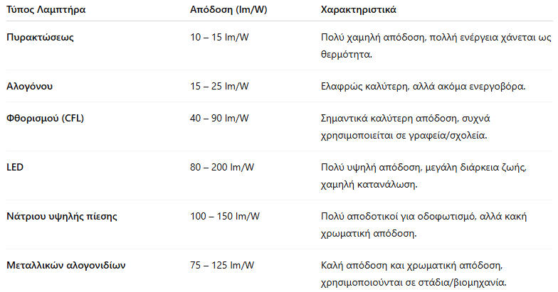 Παράγοντες που Επηρεάζουν τη Φωτιστική ΑπόδοσηΤεχνολογία λαμπτήρα (π.χ. LED vs. πυρακτώσεως).Θερμοκρασία λειτουργίας (κάποιοι λαμπτήρες έχουν ιδανική θερμοκρασία).Γήρανση λαμπτήρα – με τον χρόνο η απόδοση πέφτει.Τροφοδοσία (σταθερό ρεύμα/τάση βοηθά στη σταθερή απόδοση).Γιατί μας ενδιαφέρει η Φωτιστική Απόδοση;Για εξοικονόμηση ενέργειας (σημαντικό σε κτίρια, δρόμους, σχολεία).Για μείωση κόστους λειτουργίας.Γιαπεριβαλλοντικούςλόγους(λιγότερηκατανάλωσηρεύματος→λιγότερο CO₂).Γιαβελτιστοποίησηφωτισμούσεκάθεχώρο(σωστήισορροπίαμεταξύ απόδοσης και χρωματικής ποιότητας).