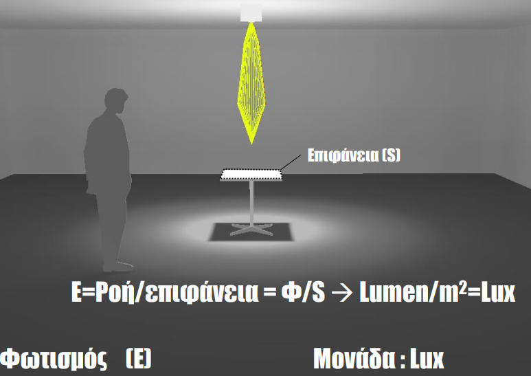 Ημονάδαφωτισμούεπιφάνειας(lux)συνιστάτοφωςπουπαράγεταιαπόφωτεινήροή1lm ηοποίαπέφτεισεμιαπεριοχήμεεμβαδόν1m².Ωστόσο,οφωτισμόςεπιφάνειας καθορίζεταιεπίσηςαπότηναπόστασητηςφωτεινήςπηγήαπότηφωτίζουσαεπιφάνεια (όσομεγαλύτερηείναιηαπόσταση,τόσοπερισσότεραlumensχρειάζονται),απότη γωνία/διεύθυνσητωνακτινώνφωτόςπουπέφτουν(όσομικρότερηείναιηγωνία πρόσπτωσης, τόσο πιο αδύναμος είναι ο φωτισμός). Ότανλοιπόναγοράζουμεμιαφωτεινήπηγή,συνιστάταιναελέγχουμετοναριθμότων λούμεν(lm),οοποίοςαναγράφεταιστοκουτίτουλαμπτήρα.Οαριθμόςτωνλούμενείναιμια μονάδαμέτρησηςτηςφωτεινότητας,ηοποίαυποδηλώνειτησυνολικήποσότηταφωτόςπου εκπέμπεται από τη φωτεινή πηγή προς όλες τις κατευθύνσεις σε ένα δευτερόλεπτο.