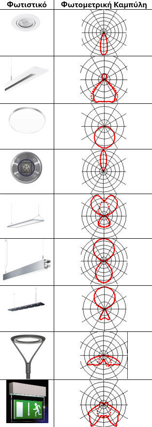 Στο επόμενο παράδειγμα φωτομετρικής καμπύλης ενός φωτιστικού παίρνουμε τις αντίστοιχες φωτεινές εντάσειςΣτην κατεύθυνση των 40ο αντιστοιχεί φωτεινή ένταση Ι40=89cdΣτην κατεύθυνση των 90ο αντιστοιχεί φωτεινή ένταση Ι90=78cdΣτην κατεύθυνση των 180ο αντιστοιχεί φωτεινή ένταση Ι180=0cdΣτην προηγούμενη καμπύλη φωτεινής έντασης βλέπουμε πως η ευνοικότερη περίπτωση έντασης φωτισμού από το συγκεκριμένο φωτιστικό βρίσκεται στην κατεύθυνση μεταξύ 0ο και 70ο και η χειρότερη στις 180ο (πάνω από το φωτιστικό).Κάθε καμπύλη φωτεινής έντασης αναφέρεται συνήθως σε λαμπτήρα φωτεινής ροής 1000lm, οπότε για την εύρεση της έντασης κάθε λαμπτήρα πολλαπλασιάζουμε την τιμή του διαγράμματος με τον κατάλληλο συντελεστή. Για παράδειγμα αν μελετάμε φωτιστικό σώμα λαμπτήρα υδραργύρου υψηλής πίεσης φωτεινής ροής 13500lm, οι τιμές της φωτεινής έντασης που λαμβάνονται από το πολικό διάγραμμα θα πρέπει να πολλαπλασιάζονται με το συντελεστή 13,5 (13500/1000=13,5).