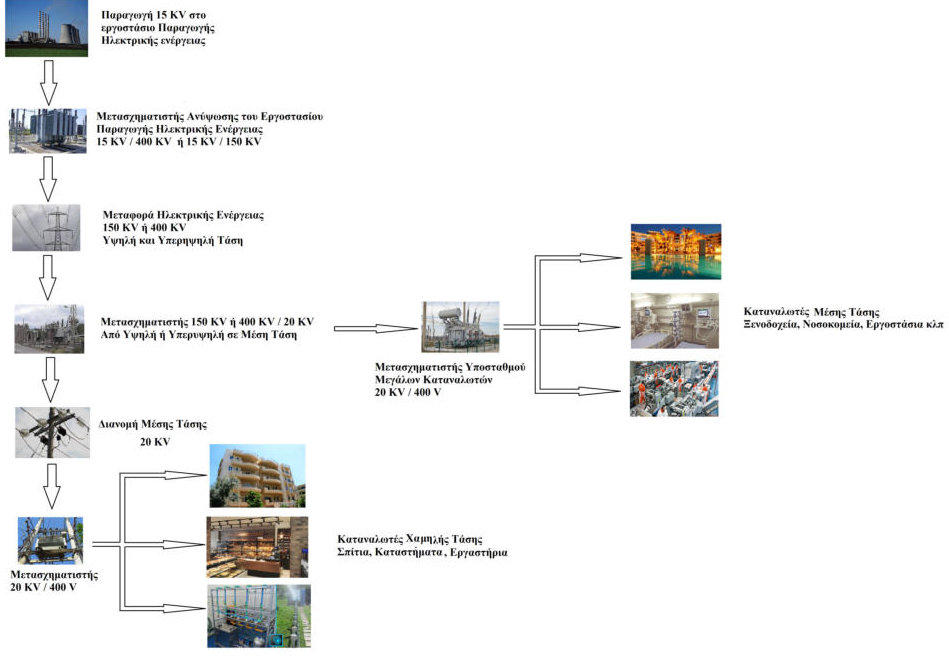 ΚΕΦΑΛΑΙΟ 1: Γενικές Έννοιες και ΓνώσειςΟΡΙΣΜΟΙΗλεκτρικήΕγκατάστασηονομάζουμετοσύνολοτωναγωγών,μηχανημάτωνκαιεξαρτημάτωνπουσυνδέονταιμεταξύτουςκατάλληλακαιχρησιμεύουνγιατηνπαραγωγήτης ηλεκτρικής ενέργειας , για την μεταφορά της από το σημείο παραγωγής της έως τις θέσεις καταναλώσεως της και για την χρησιμοποίηση τηςΕσωτερικήΗλεκτρικήΕγκατάσταση(Ε.Η.Ε.)είναιμιαηλεκτρικήεγκατάστασηπουλειτουργείμεαποκλειστικήευθύνηενόςκαταναλωτή,τροφοδοτείταισεένασημείοτηςμε ηλεκτρική ενέργεια και χρησιμεύει για να διοχετεύει αυτήν την ενέργεια σε συσκευές καταναλώσεως Καταναλωτήςείναιέναςιδιώτηςήμιαεταιρείαήμιαδημόσιαυπηρεσίακλπ,πουχρησιμοποιείτονχώροστονοποίοβρίσκεταιηΕΗΕκαικαταναλώνειτηνηλεκτρικήενέργειαμε ευθύνη του .ΣυσκευέςΚαταναλώσεωςείναιόλεςοισυσκευέςπουκαταναλώνουνηλεκτρικήενέργεια,μετατρέποντάςτηνσεκάποιαάλλημορφήενέργειαςόπωςφωτιστική,θερμική,κινητική, ηχητική κ.τ.λ. Οι αντίστοιχες συσκευές είναι οι λάμπες , οι ηλεκτρικοί θερμοσίφωνες ,οι ηλεκτρικοί κινητήρες, στερεοφωνικά ηχοσυστήματα , κ.τ.λ.ΠΑΡΑΓΩΓΗ , ΜΕΤΑΦΟΡΑ ΚΑΙ ΔΙΑΝΟΜΗ ΗΛΕΚΤΡΙΚΗΣ ΕΝΕΡΓΕΙΑΣΣημείωση:ΣτηνΑττικηηΜέσηΤάσηστουςυποσταθμούςδιανομήςτηςΔΕΗείναικυρίως20KVενώστηνεπαρχία15KV.Υπάρχουνόμωςκαιπαλαιοίυποσταθμοίμεμέσητάση6,6 KV ή 22 KV . Η ΔΕΗ όμως προσανατολίζεται στην επικράτιση των υποσταθμών διανομής 20KV .Ηηλεκτρικήεγκατάστασηπουαπαιτείταιγιατηνπαραλαβή,διανομήκαιχρησιμοποίησητηςηλεκτρικήςενέργειαςστοεσωτερικότουκαταναλωτήονομάζεταιΕσωτερικήΗλεκτρική Εγκατάσταση η οποία αποτελεί ιδιοκτησία του καταναλωτή .Ερωτήσεις ΕμβαθυνσηςΓια ποιο λόγο πιστεύετε ότι η ΔΕΗ αυξάνει την παραγόμενη τάση από τα 15 KV σε 150 KV ή 400 KV ώστε να μεταφέρει την ηλεκτρική ενέργεια μέσω των γραμμών μεταφοράς; Ναέχετευπόψησαςότιότανέναςμετασχηματιστήςαυξάνειτηντάση,τότεμειώνειτηνέντασητουρεύματοςμε,περίπου,τηνίδιααναλογία.Συνεπώςημείωσητηςέντασηςτου ρεύματος με ποιον τρόπο εξυπηρετεί την μεταφορά της ηλεκτρικής ενέργειας σε μεγάλες αποστάσεις;Μεβάσητηναπάντησηστηνπαραπάνωερώτηση,μπορείτεναφανταστείτεγιατίτελικάεπικράτησετοεναλλασσόμενοσεσχέσημετοσυνεχέςρεύμασταΔίκτυαΠαραγωγής, Μεταφοράς και Διανομής Ηλεκτρικής Ενέργειας;Να έχετε υπόψη σας ότι ένας μετασχηματιστής λειτουργεί μόνο στην εναλλασσόμενη τάση και όχι στην συνεχή.Με ποιον τρόπο θα μπορούσαμε να μεταφέρουμε ηλεκτρική ενέργεια συνεχούς τάσης σε πολύ μεγάλη απόσταση χωρίς μεγάλες απώλειες; Σκεφτείτεότιεπειδήοιαπώλειεςείναιανάλογεςτηςαντίστασης-όσομεγαλύτερηαντίστασηέχουνοιαγωγοίμεταφοράςηλεκτρικήςενέργειαςτόσομεγαλύτερεςκαιοιαντίστοιχες απώλειες - θα πρέπει να βρούμε τρόπο να μειώσουμε την εν λόγω αντίσταση.Παρόλο που με τον συγκεκριμένο τρόπο λύνουμε, σχετικά, το πρόβλημα των απωλειών κατά τη μεταφορά, ποια άλλα προβλήματα εμφανίζονται που καθιστούν τη λύση ανέφικτη; Γιατηνεξασφάλισηστηνπράξηπροστασίαςσεπρόσωπα,κτίριακαισεότιυπάρχειμέσασεαυτόαπότουςκινδύνουςπουπροέρχονταιαπότηνχρήσητηςηλεκτρικήςενέργειας έχουν θεσπιστεί οι Κανονισμοί Εσωτερικών Ηλεκτρικών Εγκαταστάσεων (Κ.Ε.Η.Ε.) . ΔΙΑΚΡΙΣΗ ΤΩΝ ΕΣΩΤΕΡΙΚΩΝ ΗΛΕΚΤΡΙΚΩΝ ΕΓΚΑΤΑΣΤΑΣΕΩΝΑΠΑΙΤΗΣΕΙΣ ΛΕΙΤΟΥΡΓΙΑΣ ΤΩΝ Ε. Η. Ε. 1.«Ασφαλής λειτουργία» , δηλαδή να είναι ακίνδυνη για τα άτομα που την χρησιμοποιούν , τα κτίρια που την περιβάλλουν , καθώς και τα υλικά που περιλαμβάνει . 2.«Καλήλειτουργία»,δηλαδή