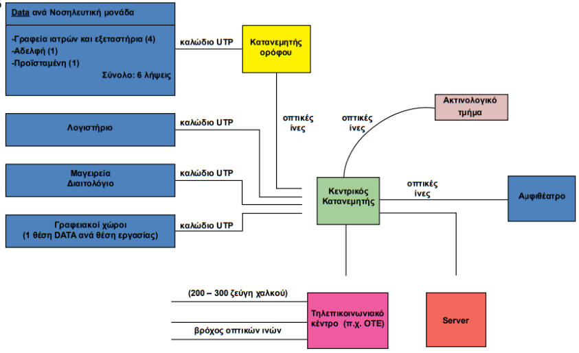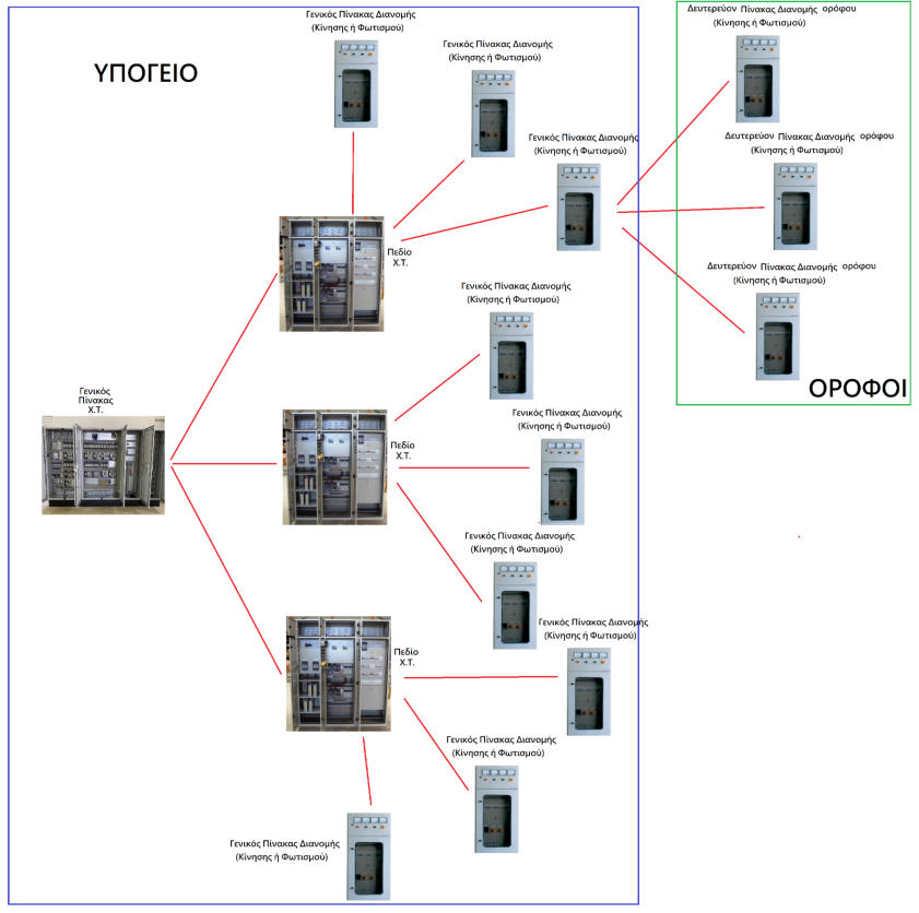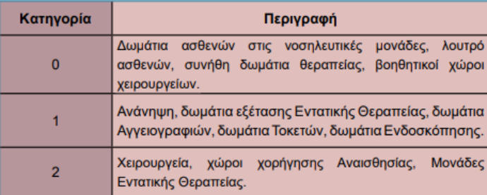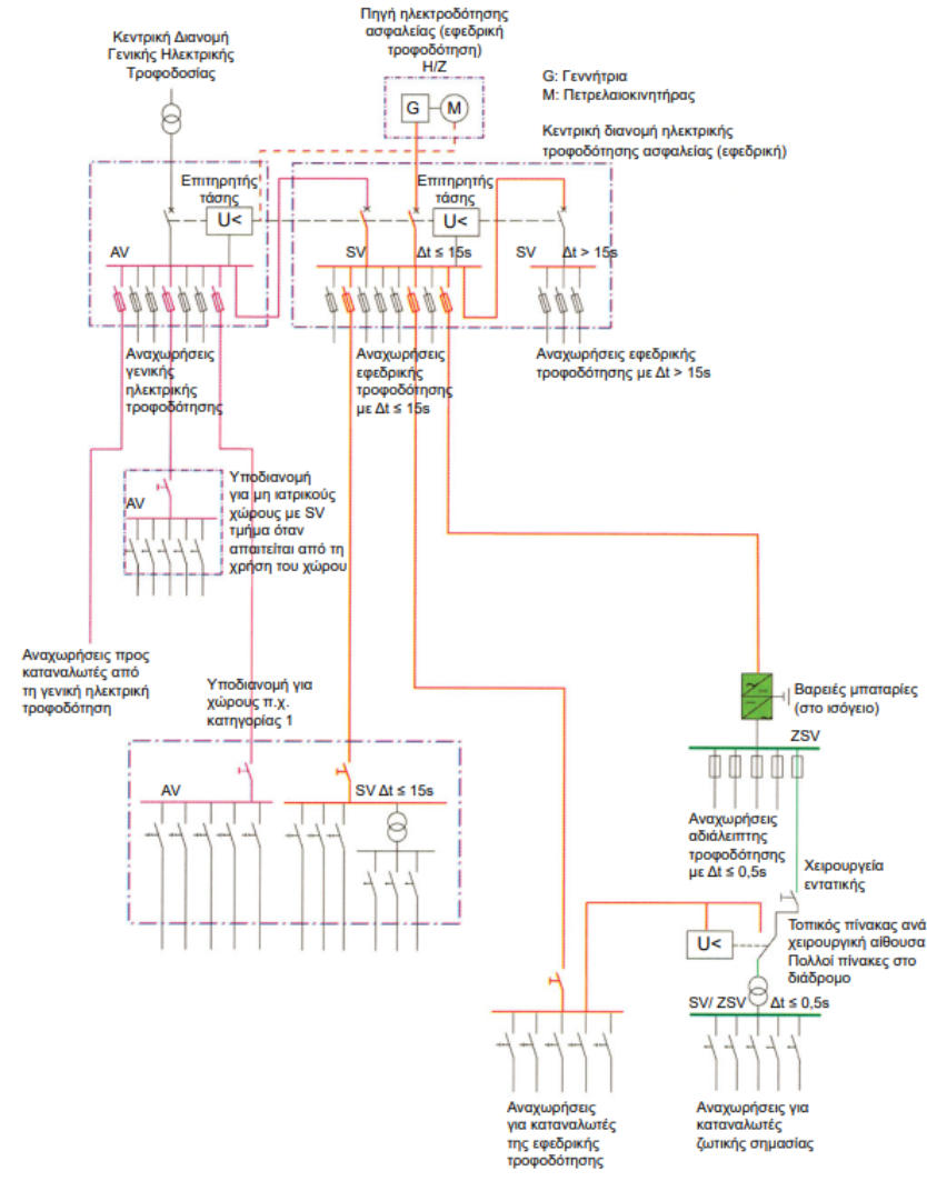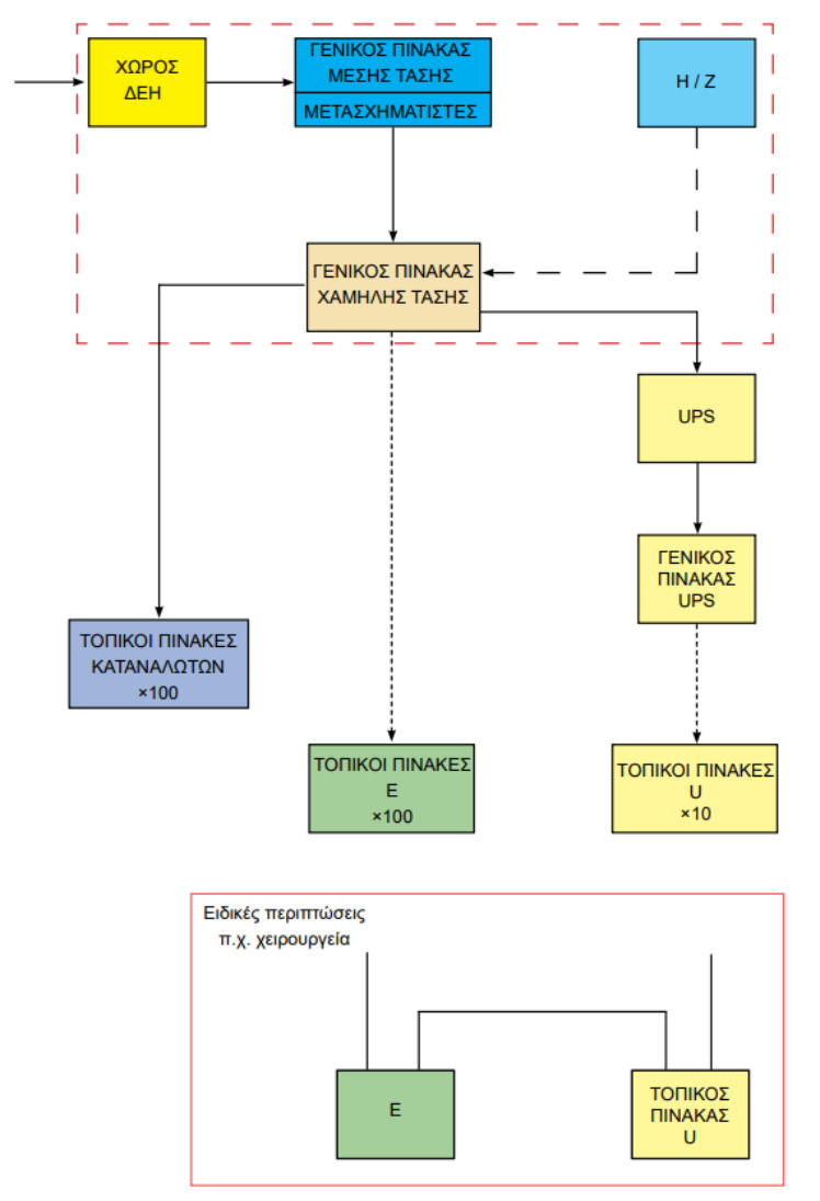 Οι ηλεκτρικές εγκαταστάσεις διακρίνονται σε εγκαταστάσεις ισχυρών ρευμάτων και ασθενών ρευμάτων:Α. Στις ηλεκτρικές εγκαταστάσεις ισχυρών ρευμάτων περιλαμβάνονται: • Σύστημα μέσης τάσης 20 kV, 50 Hz. • Υποσταθμός υποβιβασμού τάσης 20 kV/400V, 50 Hz. • Σύστημα διανομής 230/ 400 V, 50 Ηz. • Σύστημα διανομής ανάγκης (emergency) 230/400 V, 50 Ηz. • Σύστημα αδιάλειπτης λειτουργίας (UPS). • Καταναλώσεις φωτισμού και κίνησης 230/400 V. •Σύστηματροφοδοσίαςηλεκτρονόμωνλειτουργίαςκαιπροστασίαςτωνγενικώνπινάκωνμέσηςκαιχαμηλής τάσης. • Τοπικά συστήματα 42 V, 50 Ηz. • Συστήματα γειώσεων προστασίας και αλεξικεραυνικής προστασίας. • Ο ιατρικός και ξενοδοχειακός εξοπλισμός. Β. Στις ηλεκτρικές εγκαταστάσεις ασθενών ρευμάτων περιλαμβάνονται: • Εγκατάσταση τηλεφώνων και δεδομένων (data). • Εγκατάσταση ενδοσυνεννοήσεων, θυροτηλεφώνων, κουδουνιών. • Εγκατάσταση τηλεόρασης και μετάδοσης ήχου, μεγαφωνικές εγκαταστάσεις. • Κλήση νοσοκόμας. • Ρολόγια. • Σύστημα αναζήτησης προσώπων. • Εγκατάσταση συστήματος προτεραιότητας εξωτερικών ιατρείων. • Εγκατάσταση συναγερμού έναντι κλοπήςΠηγές ενέργειαςΥπόκανονικέςσυνθήκεςτονοσοκομείοεξυπηρετείταιαπόδίκτυο μέσης τάσηςεταιρείαςπαραγωγήςκαι διανομής ηλεκτρικής ενέργειας (π.χ. ΔΕΗ).Γιατηνπερίπτωσηδιακοπήςτηςπαροχήςαπότηνεταιρείαήγιαπερίπτωσημερικήςβλάβηςτηςεγκατάστασης τουΥποσταθμού(αστοχίαενόςμετασχηματιστήήσφάλμαμιαςφάσηςήμείωσητηςτάσηςτουδικτύουτης εταιρείαςκάτωαπότηναποδεκτήστάθμητου10%),προβλέπεταιητροφοδοσίακρίσιμωνκαταναλώσεωνμέσω ηλεκτροπαραγωγών ζευγών.Εκτός από τις πιο πάνω πηγές ενέργειας, προβλέπεται και σύστημα αδιάλειπτης λειτουργίας (UPS), με συστοιχία μπαταριών που καλύπτει τα κρίσιμα φορτία ιατρικού εξοπλισμού, σύμφωνα με τον κανονισμό VDE 0107.Εγκατάσταση υποσταθμού μέσης τάσηςΤυπική κάτοψη των χώρων υποσταθμού μέσης τάσηςΓιατηνεγκατάστασητουυποσταθμούμέσηςτάσηςσειδιαίτεροχώροτουνοσοκομείου,συνήθωςισόγειο, διατίθενται:•χώρος για την εταιρεία διανομής ηλεκτρικής ενέργειας (π.χ. ΔΕΗ),•χώρος γενικού πίνακα μέσης τάσης του νοσοκομείου,•χώροι για καθένα μετασχηματιστή,•χώροι γενικών πινάκων χαμηλής τάσης (για τα πεδία χαμηλής τάσης και για τους γενικούς πίνακες),•χώρος για τα ηλεκτροπαραγωγά ζεύγηΧώρος εταιρείας διανομής ηλεκτρικής ενέργειας (π.χ. ΔΕΗ)Ητροφοδοσίατουνοσοκομείουγίνεταισυνήθωςαπότοεναέριοδίκτυομέσηςτάσηςτηςεταιρείας(20kV,50 Hz)σταόριατουοικοπέδουτου.Απόεκεί(μέσωυπόγειωνσωληνώσεωνκαιφρεατίωντραβήγματοςκαλωδίων), τακαλώδιατων20kVοδηγούνταιστονιδιαίτεροισόγειοχώροπουδιατίθεταιγιατηνεταιρεία.Σ’αυτότο χώρο,πουείναιδιαμορφωμένοςκαιεξοπλισμένοςσύμφωναμετιςυποδείξειςτηςεταιρείας,εγκαθίσταταιο πίνακας μέσης τάσης της εταιρείας και τα όργανα μέτρησης της παρεχόμενης ενέργειας.Χώρος γενικού πίνακα μέσης τάσηςΣτοχώροαυτόεγκαθίσταταιογενικόςπίνακαςμέσηςτάσηςτουνοσοκομείουπουείναιτύπουπεδίου (κυψελών) και αποτελείται από:•το πεδίο ή πεδία άφιξης της μέσης τάσης,•ένα πεδίο αναχώρησης για κάθε μετασχηματιστή ισχύος,•έναπεδίοαναχώρησηςπροςδεύτερογενικόπίνακαμέσηςτάσης(ανυπάρχει,σεπερίπτωση απομακρυσμένου κτιρίου).Κάθεπεδίοπεριλαμβάνειόλατααπαραίτηταόργαναλειτουργίας,διακοπήςκαιπροστασίας.Ητροφοδοσίατων μετασχηματιστών γίνεται με μονοπολικά καλώδια των 20 kV.Στουςχώρουςκάτωαπότονυποσταθμόδημιουργείταιυπόγειοκαθαρούύψουςτουλάχιστονενόςμέ