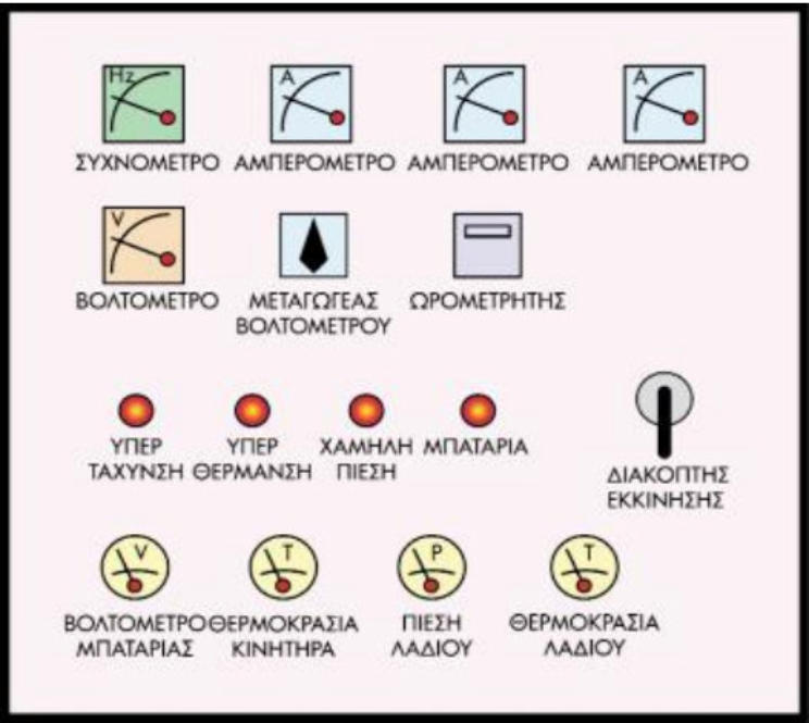 Πίνακας Ελέγχου, Αυτοματισμού και Μεταγωγής ΙσχύοςΟπίνακαςέχειμορφήερμαρίου(ντουλαπιού),κατασκευάζεταιαπόχαλυβδόφυλλα,διαθέτει πόρταεπιθεώρησηςκαιπεριέχειταόργανα,τιςσυσκευέςκαιτιςδιατάξειςπουείναιαπαραίτητα για την προστασία και για τη χειροκίνητη ή αυτόματη λειτουργία του Η/Ζ.Στην πόρτα του πίνακα τοποθετούνται:Όργανα παρακολούθησης της λειτουργίας του Η/Ζ, όπως:•Συχνόμετρο 47 – 53 Hz,•Αμπερόμετρα, ένα για κάθε φάση,•Βολτόμετρο 0 – 500 V,•Επιλογικός διακόπτης (μεταγωγέας) βολτομέτρου, ο οποίος είναι συνήθως 6 θέσεων.•Ωρόμετρογιατημέτρησητωνωρώνλειτουργίαςτουκινητήρα,οιοποίεςείναιαπαραίτητες για τη συντήρησή του,•Θερμόμετρο, το οποίο μετράει τη θερμοκρασία του νερού ψύξης,•Μανόμετρολαδιού,τοοποίομετράειτηνπίεσητουλαδιούκαιΒολτόμετρογιατημέτρηση της τάσης της αντιστοιχίας των συσσωρευτών.Ενδεικτικές λυχνίες, όπως:•Τροφοδοσίας του ηλεκτρικού φορτίου από τη γεννήτρια,•Χαμηλής πίεσης λαδιού του κινητήρα,•Υψηλής θερμοκρασίας νερού του συστήματος ψύξης του κινητήρα,•Υπερτάχυνσηςτουκινητήρα,μόνοότανοκινητήραςείναιεξοπλισμένοςμεηλεκτρονικό ρυθμιστή ταχύτητας,•Διαθεσιμότητας τάσης Η/Ζ, μία για κάθε φάση,•Λειτουργίας προθέρμανσης,•Αποτυχίας εκκίνησης,•Τάση δικτύου εκτός ορίων (+,_10 της ονομαστικής) και•Τάση γεννήτριας εκτός ορίων (+,_10 της ονομαστικής).Κουμπιά(μπουτόν)καιδιακόπτεςχειρισμούγιααυτόματηήχειροκίνητηλειτουργίατουΗ/Ζ, όπως:•Επιλογικό διακόπτη 3 ή 4 θέσεων για τις παρακάτω λειτουργίες του Η/Ζ,•Αυτόματη,•Χειροκίνητη και Εκτός (OFF)•Μπουτόν εκκίνησης Η/Ζ,•Μπουτόν παύσης Η/Ζ,•Μπουτόν στάσης κινδύνου (emergency stop),•Μπουτόν παύσης σειρήνας και•Μπουτόν ελέγχου λειτουργίας ενδεικτικών λυχνιώνΣτο εσωτερικό του πίνακα υπάρχουν:•Το σύστημα προστασίας της γεννήτριας από υπερφόρτιση και βραχυκύκλωμα.Χρησιμοποιείταισυνήθωςαυτόματοςτριπολικόςδιακόπτης(CircuitBreaker),οοποίοςδιαθέτει θερμικόστοιχείογιαπροστασίααπόυπερφόρτισηκαιηλεκτρομαγνητικόστοιχείογιαπροστασία από βραχυκυκλώματα.•Τα συστήματα προστασίας του κινητήρα από:Υπερτάχυνση.Ότανσυμβείυπερτάχυνσηστονκινητήρα,τοσύστημααυτόδιακόπτειτη λειτουργία του Η/Ζ και ενεργοποιεί την ενδεικτική λυχνία υπερτάχυνσης και τη σειρήνα.Χαμηλήπίεσηλαδιού.Ότανηπίεσητουλαδιούείναιχαμηλή,τοσύστημααυτόδιακόπτειτη λειτουργία του Η/Ζ και ενεργοποιεί την ενδεικτική λυχνία λαδιού και τη σειρήνα.Υψηλήθερμοκρασίανερούτουσυστήματοςψύξηςτουκινητήρα.Ότανηθερμοκρασίαλαδιού είναιυψηλή,τοσύστημααυτόδιακόπτειτηλειτουργίατουΗ/Ζκαιενεργοποιείτηνενδεικτική λυχνία υπερτάχυνσης και τη σειρήνα.•Κύκλωμα αυτοματισμού που αποτελείται από:o Ηλεκτρονόμους των βοηθητικών κυκλωμάτων,o Τα ρυθμιζόμενα χρονικά για την εκκίνηση και το σταμάτημα του Η/Ζo Τις ασφάλειες των βοηθητικών κυκλωμάτων.•Φορτιστή 12 ή 24 V DC για συντηρητική φορτιστή των συσσωρευτών από το δίκτυο.•Μετασχηματιστές (έντασης) ρεύματος, ένας για κάθε αμπερόμετρο.•Κύκλωμαισχύοςστοοποίοπεριέχεταιομεταγωγικόςδιακόπτης,πουαποτελείταιαπόδύο αυτόματουςισχύοςμεμηχανικήκαιηλεκτρικήμανδάλωσηγιατοναποκλεισμότης τροφοδότησηςτουφορτίουταυτόχρονααπότοδίκτυοτηςΔΕΗκαιαπότοΗ/Ζ.Οιαυτόματοι ισχύοςείναιτετραπολικοί,δηλαδήδιακόπτουντιςτρειςφάσειςκαιτονουδέτεροκαιοένας τη γραμμή του δικτύου της ΔΕΗ ενώ ο άλλος τη γραμμή της γεννήτριας.