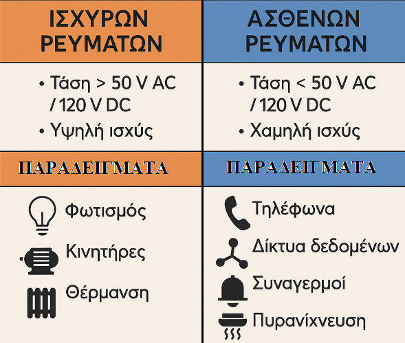 Οιηλεκτρικέςεγκαταστάσειςισχυρώνρευμάτωνείναιταηλεκτρικάσυστήματαπουλειτουργούν μευψηλότερεςτάσειςκαιυψηλήισχύ,καιέχουνωςκύριοσκοπότηνπαροχήενέργειαςγια φωτισμό, κίνηση μηχανών, θέρμανση και άλλες ενεργοβόρες εφαρμογές.ΟρισμόςΣύμφωνα με τα πρότυπα, θεωρούνται ισχυρά ρεύματα εκείνα που:Έχουν τάση μεγαλύτερη από περίπου 50 V AC ή 120 V DC.Μεταφέρουν σημαντική ισχύ (υψηλή ένταση ρεύματος).Σχεδιάζονται ώστε να καλύπτουν τις ενεργειακές ανάγκες καταναλωτών.Παραδείγματα εγκαταστάσεων ισχυρών ρευμάτωνΦωτισμόςΟικιακός φωτισμός, επαγγελματικός φωτισμός, φωτισμός δρόμων.ΚίνησηΤροφοδοσία ηλεκτρικών κινητήρων σε βιομηχανίες, αντλίες, ανελκυστήρες.ΘέρμανσηΗλεκτρικές αντιστάσεις, θερμαντικά σώματα, θερμοσίφωνες.Κλιματισμός και ψύξηΣυστήματα air-condition και ψυκτικές μονάδες.Ηλεκτρομηχανικά συστήματαΜηχανήματα παραγωγής, εργαλειομηχανές, μεγάλοι συμπιεστές.Βασικά χαρακτηριστικάΜεγαλύτερη επικινδυνότητα --> απαιτείται προστασία από ηλεκτροπληξία και υπερφορτίσεις.Χρήση καλωδίων μεγαλύτερης διατομής για μεταφορά ισχυρών ρευμάτων.Συστήματα προστασίας (ασφάλειες, μικροαυτόματοι, διακόπτες διαρροής).Διανομή μέσω πινάκων με διακόπτες και γραμμές προς κάθε καταναλωτή.