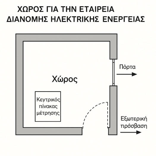 Οχώροςγιατηνεταιρείαδιανομήςηλεκτρικήςενέργειαςείναιοειδικάδιαμορφωμένοςχώρος σε ένα κτίριο ή εγκατάσταση, όπου τοποθετούνται οι υποδομές που απαιτούνται για:Την παροχή ρεύματος από το δίκτυο της εταιρείας (π.χ. ΔΕΔΔΗΕ στην Ελλάδα).Τη μέτρηση της καταναλισκόμενης ενέργειας.Την προστασία και ασφάλεια των εγκαταστάσεων και του προσωπικού της εταιρείας.Κύρια χαρακτηριστικάΘέσηΣυνήθως στο ισόγειο ή σε εύκολα προσβάσιμο σημείο του κτιρίου.Εξωτερικήπρόσβασηγιατουςτεχνικούςτηςεταιρείαςχωρίςναχρειάζεταιείσοδοςστους ιδιωτικούς χώρους.ΠεριεχόμενοΚεντρικός πίνακας μέτρησης (μετρητές, ασφαλειοδιακόπτες εισόδου).Καλωδιώσεις εισόδου από το δίκτυο διανομής.Σε μεγάλες εγκαταστάσεις: υποσταθμός ή μετασχηματιστής μέσης/χαμηλής τάσης.ΑσφάλειαΠρέπει να πληροί πρότυπα (π.χ. ΕΛΟΤ HD 384).Κλειδωμένος χώρος με σήμανση.Αντοχή σε φωτιά και υγρασία.Επαρκής αερισμός.ΛειτουργίαΕκείγίνεταιημεταφοράκαιδιανομήτηςηλεκτρικήςενέργειαςαπότοδίκτυοτηςεταιρείαςπρος τις εσωτερικές εγκαταστάσεις του κτιρίου.Οι μετρητές καταγράφουν την κατανάλωση για την τιμολόγηση.Σε περίπτωση βλάβης ή ελέγχου, η πρόσβαση γίνεται μόνο από εξουσιοδοτημένο προσωπικό