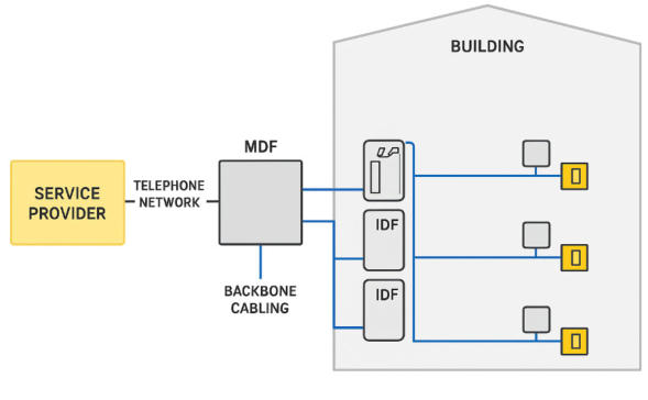 Ηεγκατάστασητηλεφώνωνκαιδεδομένων(data)σεμεγάλακτίριαείναιτμήματωνηλεκτρικών εγκαταστάσεωνασθενώνρευμάτωνκαιαφοράτημετάδοσηφωνής,δεδομένωνκαιεικόναςμέσω δικτύου καλωδίωσης και εξοπλισμού.Βασικές αρχέςΔομημένη καλωδίωση (Structured Cabling)Πρότυπο: ISO/IEC 11801 ή EN 50173.Ενιαίοδίκτυογιατημεταφοράφωνής,δεδομένωνκαισεπολλέςπεριπτώσειςIPτηλεόρασηςή συστημάτων ασφαλείας.Επιτρέπει εύκολες αλλαγές και επεκτάσεις χωρίς ξήλωμα καλωδίων.Κεντρικός κατανεμητής (MDF) και επιμέρους κατανεμητές (IDF)Ο MDF συνδέεται με την εξωτερική γραμμή τηλεφωνίας / internet.Οι IDF βρίσκονται σε επιλεγμένα σημεία του κτιρίου για μείωση του μήκους καλωδίων.Όλοι συνδέονται με κατακόρυφες οδεύσεις (backbone cabling).Κατηγορίες καλωδίωνCat5e: έως 1 Gbps (συνήθως σε παλαιότερες εγκαταστάσεις).Cat6 / Cat6A: έως 10 Gbps σε 100 m.Οπτική ίνα: για backbone ή μεγάλες αποστάσεις και πολύ υψηλές ταχύτητες.Βασικά στοιχεία εγκατάστασηςΡάφια και racks για patch panels και εξοπλισμό δικτύου (switches, routers, PBX).Patch panels για τερματισμό καλωδίων και εύκολη επανασύνδεση.Διαδρομές καλωδίων: κανάλια, σωληνώσεις ή υπερυψωμένα δάπεδα.Σημεία τερματισμού: πρίζες RJ45 ή οπτικές υποδοχές.Σήμανση καλωδίων και καταγραφή στο σχέδιο εγκατάστασης.Ασφάλεια & ΚανονισμοίΑσθενές ρεύμα (<50 V), αλλά ισχύουν κανόνες πυρασφάλειας και καναλιών.Καλώδια LSZH (Low Smoke Zero Halogen) σε κτίρια με υψηλή συγκέντρωση ατόμων.Διαχωρισμόςδιαδρομώνασθενώνρευμάτωναπόισχυράρεύματα(ελάχιστηαπόστασηήχρήση θωρακισμένων καλωδίων).Πρόβλεψη για γείωση των μεταλλικών μερών του εξοπλισμού.Παραδείγματα εφαρμογών σε μεγάλα κτίριαΕταιρικά γραφεία: IP τηλέφωνα, τοπικό δίκτυο, cloud εφαρμογές.Νοσοκομεία: δίκτυα ιατρικών συσκευών και τηλεφωνικής επικοινωνίας.Ξενοδοχεία: συνδυασμός τηλεφωνίας, internet και IPTV.Εμπορικά κέντρα: data δίκτυα για διαχείριση POSκαι CCTV.