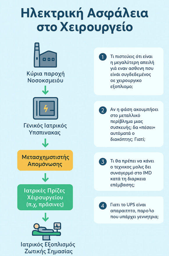 Ητροφοδοσίαχώρωνιατρικήςχρήσηςμεηλεκτρικήενέργειαείναιέναειδικόκεφάλαιοτων ηλεκτρικώνεγκαταστάσεων,καθώςαφοράτηνασφάλειαασθενώνκαιπροσωπικούσεχώρους όπου λειτουργούν ιατρικές συσκευές και εξοπλισμός υποστήριξης ζωής.Βασικά σημεία:Κατηγορίες ιατρικών χώρων (σύμφωνα με πρότυπα όπως ΕΛΟΤ HD 60364-7-710):Ομάδα0:Χώροιόπουδενγίνεταισύνδεσητουασθενήσεεξοπλισμόπουδιεισδύειστοσώμαή το κυκλοφορικό σύστημα.Ομάδα1:Χώροιόπουγίνεταισύνδεσηεξοπλισμούπουμπορείναεπηρεάσειάμεσαασθενή, αλλά όχι στο επίπεδο καρδιάς ή κυκλοφορικού.Ομάδα2:Χώροιμεχειρουργικέςεπεμβάσειςήεξοπλισμόπουσυνδέεταιστοκυκλοφορικόή στην καρδιά.Τεχνικές απαιτήσειςΑπομόνωσηδικτύου(IsolatedPowerSupply–IPS)σεχώρουςομάδας2,ώστεναπεριορίζονται ταρεύματαδιαρροήςκαιναυπάρχεισυνεχήςλειτουργίαακόμακαισεπερίπτωσησφάλματος μόνωσης.Σύστημα επιτήρησης μόνωσης (IMD) που ειδοποιεί άμεσα για σφάλμα.Διπλή τροφοδοσία ή εναλλακτική πηγή (π.χ. γεννήτρια, UPS) για κρίσιμα φορτία.Χαμηλές αντιστάσεις γείωσης για την προστασία από επικίνδυνα δυναμικά.Τυπική διάταξη τροφοδοσίαςΚύρια παροχή από τον γενικό πίνακα του νοσοκομείου.Υποπίνακας χώρου με ξεχωριστές ασφάλειες και διακόπτες.Μετασχηματιστής απομόνωσης για κρίσιμες γραμμές.Ιατρικές πρίζες ειδικής κατασκευής και χρώματος, για να ξεχωρίζουν από τις κοινές.Πρότυπα και κανονισμοίΕΛΟΤ HD 60364-7-710 (ελληνική προσαρμογή του IEC 60364-7-710)IEC 60364Υγειονομικές οδηγίες και τεχνικές προδιαγραφές νοσοκομειακών υποδομών
