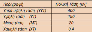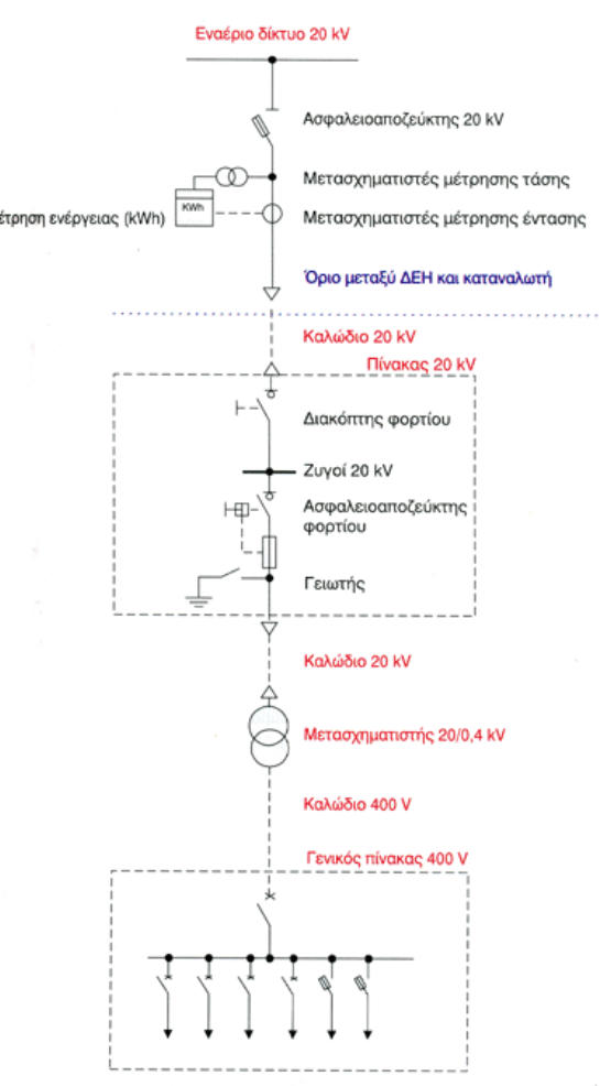 Τύποι παροχών μέσης τάσηςΗ ΔΕΗ έχει τυποποιήσει τέσσερις τύπους παροχών μέσης τάσης:Παροχή τύπου Α1 και Α2Ηπαροχήαυτήγίνεταιαπότοεναέριοδίκτυοτων20kVκαιείναιηαπλούστερησεδιατάξεις.Τα μέσαπουχρησιμοποιείηΔΕΗ,δηλαδήασφαλειοαποζεύκτης,Μ/Σμέτρησηςέντασηςκαιτάσης είναιπάνωσεστύλο,δηλαδήυπαίθρια.Οιμετρητέςενέργειαςτοποθετούνταισεειδικόερμάριο. Απότοστύλοαναχωρείκαλωδιακήγραμμήπροςτονυποσταθμότουκαταναλωτή,τηνοποία κατασκευάζειοκαταναλωτής.ΗπαροχήΑ1ασφαλίζεταιμεασφάλειεςεκτόνωσηςβραδείας τήξηςονομαστικήςέντασηςμέχρι30Α.ΗπαροχήΑ2διαφέρειαπότηνΑ1στοότιχρησιμοποιεί διακόπτη απομόνωσης αντί ασφαλειοαποζεύκτη.Παροχή τύπου B1 και B2Ηπαροχήαυτήεγκαθίσταταισεκαταναλωτέςμεαυξημένηζήτησηισχύοςκαιηεγκατάστασητης ΔΕΗείναιεσωτερικούτύπου.ΟκαταναλωτήςείναιυποχρεωμένοςναδιαθέσειστηΔΕΗέναχώρο διαμορφωμένοσύμφωναμετιςοδηγίεςτηςΔΕΗ.ΣτοχώροαυτόηΔΕΗεγκαθιστάέναν προκατασκευασμένοπίνακα20kVπουπεριλαμβάνειεκτόςτωνδιακοπτών,τουςΜ/Σμέτρησης καιτουςμετρητέςενέργειας.ΗσύνδεσημετοδίκτυοτηςΔΕΗγίνεταικατάκανόναακτινικά,αν πρόκειταιγιαεναέριοδίκτυοήβροχοειδώς,ανπρόκειταιγιαυπόγειοδίκτυο.Στηβροχοειδή σύνδεσηέχουμεδύοκαλώδιαπουοδεύουναπότοδίκτυοτηςΔΕΗστονκαταναλωτή.Τοένα καλώδιοτηςπαροχήςπροέρχεταιαπότονπροηγούμενοκαταναλωτήκαιτοάλλοκαλώδιοτης παροχής οδηγεί στον επόμενο καταναλωτή.Τυποποιημένες παροχές μέσης τάσης της ΔΕΗΤύποςΕγκατάσταση μέτρησηςΜέγιστη ισχύς μετασχηματιστήA1 Εξωτερικά (υπαίθρια) 630 kVAA2 Εξωτερικά (υπαίθρια) Περιορισμένη μόνο από το δίκτυο ΜΤB1 Εσωτερικά (στεγασμένη) 1250 kVAB2 Εσωτερικά (στεγασμένη) Περιορισμένη μόνο από το δίκτυο ΜΤ