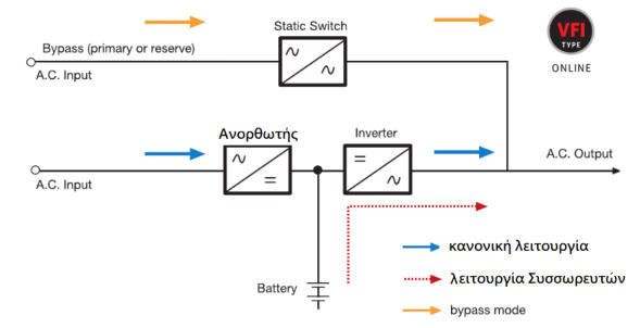 Τι είναι το UPSΜίασυσκευήαδιάλειπτηςπαροχήςενέργειας(UninterruptiblePowerSupply(UPS)),είναιμία συσκευήτροφοδοσίαςρεύματος(τροφοδοτικό)πουσυνεχίζειναπαρέχειηλεκτρικήενέργειασε περίπτωσηδιακοπήςρεύματος.Γιανακαταστείαυτόδυνατό,περιέχεικατάκανόναμίαάλλη προσωρινήπηγήενέργειας(π.χ.κάποιουείδουςσυσσωρευτή).Συνήθωςπαρέχειεπιπλέον ασφάλειαστιςσυσκευέςπουείναισυνδεδεμένεςσεαυτήν,μετοναπαρεμβάλλεταιμεταξύτους καιτοδίκτυορεύματος,προστατεύοντάςτιςαπόυπερτάσειςήπτώσειςτάσειςκαιάλλες ανωμαλίεςτουρεύματοςήτηςτάσηςτουδικτύουπαροχήςρεύματος.Σεμερικέςπεριπτώσεις διασφαλίζεικαιότιτοπαρεχόμενορεύμαέχειτηνσωστήσυχνότητα(50Hzή60Hzκλπ.ανάλογα τοδίκτυο).Ησυσκευήχρησιμεύεικυρίωςστηνπαροχήηλεκτρικήςενέργειαςμέχριτηνέναρξη μιαςβοηθητικήςγεννήτριας,μέχριναέρθειτορεύμαήμέχριναγίνειασφαλήςαπενεργοποίηση των συσκευών που είναι συνδεδεμένες σε αυτήν.Ηκύριαχρήσηαυτώντωντροφοδοτικώναυτούτουείδουςείναιγιατηνπροστασίαευαίσθητων ήπολύσημαντικώνηλεκτρονικώνήηλεκτρικώνσυσκευώνόπωςδιαφόρωνιατρικώνσυσκευών, ηλεκτρονικώνυπολογιστών,διακομιστών,τηλεφωνικώνκέντρωνκ.α.,ηαπότομη απενεργοποίησητωνοποίωνθαμπορούσεναπροκαλέσειανεπανόρθωτηβλάβηόπωςπ.χ. απώλειαζωήςασθενούς,απώλειαδεδομένων,καταστροφήυποσυσυστημάτωνκλπ.Τα τρoφοδοτικάαυτάποικίλλουνσεμέγεθος:απόπολύμικρά(μεισχύ~200VA)πουμπορούννα υποστηρίξουνένανπροσωπικόυπολογιστήέωςπολύμεγάλαπουμπορούννατροφοδοτήσουν κεντρικούς υπολογιστές (με ισχύ μερικά KVA).Πως λειτουργεί το διπλής μετατροπής ή online UPS;Μετηντεχνολογίααυτή,γνωστήωςΔιπλήςΜετατροπής,ηέξοδοςτουUPSείναιανεξάρτητη απότηντάσητροφοδοσίαςκαιτιςδιακυμάνσειςτηςσυχνότητας,οιοποίεςελέγχονταισταόρια πουέχουνπροκαθοριστεί.Στηνκανονικήλειτουργίατοφορτίοτροφοδοτείταιαπότον συνδυασμό του ανορθωτή και του Inverter.Ότανηηλεκτρικήπαροχήστηνείσοδοείναιεκτόςτωνπροκαθορισμένωνορίωντάσεωςκαι συχνότητας,τοUPSμεταβαίνεισελειτουργίααπότουςΣυσσωρευτές(BatteryMode)όπουο συνδυασμόςInverterκαισυσσωρευτώνσυνεχίζειτηντροφοδοσίατουφορτίου,έωςτην εξάντλησητηςχωρητικότηταςτωνσυσσωρευτώνήέωςτηνεπαναφοράτηςπαροχήςεισόδου εντόςτωνπροκαθορισμένωνορίων.Ημετάβασηστηλειτουργίααπόσυσσωρευτέςγίνεται ακαριαία (0 ms).ΕάνυπάρξεισφάλμαστονανορθωτήήτονInverterήσεπερίπτωσηυπερφόρτωσηςτηςεξόδου, τοUPSμεταβαίνεισελειτουργίαπαράκαμψης(ByPass),όπουτοφορτίοτροφοδοτείται προσωρινά από την εφεδρική γραμμή.ΟχρόνοςαυτονομίαςπουπαρέχουνταδιπλήςμετατροπήςήonlineUPSστασυνδεδεμένα φορτίατουςσεπερίπτωσηδιακοπήςρεύματοςαπότηνπαροχήτουδικτύουείναιείτεο συνήθηςτων5λεπτώνσεπλήρεςφορτίο,είτεεπεκτάσιμοςσεώρες,ανάλογαμετιςανάγκεςκαι το μοντέλο που θα επιλέξει ο χρήστης.Τασυγκεκριμένατροφοδοτικάαδιάλειπτηςπαροχήςενέργειαςείναικατάλληλαόταναπαιτείται ηηλεκτρικήαπομόνωσητωντροφοδοτούμενωνσυσκευώνήγιατηντροφοδοσίαμηχανημάτων πουείναιευαίσθηταστιςδιακυμάνσειςτάσεως.Ανκαιαρχικάέβρισκανεφαρμογήσε εγκαταστάσειςτων10KVΑκαιάνω,ηανάπτυξητηςτεχνολογίαςέχειεπιτρέψειτηνχρήσητους σεμικρότερασυστήματαισχύος500Wήκαιλιγότερο.Ησυγκεκριμένηκατηγορία τροφοδοτικώνείναιηκαταλληλότερηγιαπεριβάλλονταμεσημαντικόηλεκτρικόθόρυβο,όπως ένα εργοτάξιο, η μεγάλες εγκαταστάσεις όπως συστοιχίες διακομιστών.Ηυψηλήτιμήτουςοφείλεταιστηναρχήλειτουργίαςτους.Τορεύμααπότοκεντρικόδίκτυο μετατρέπεταιαπόέναανορθωτήςσεσυνεχές,τ