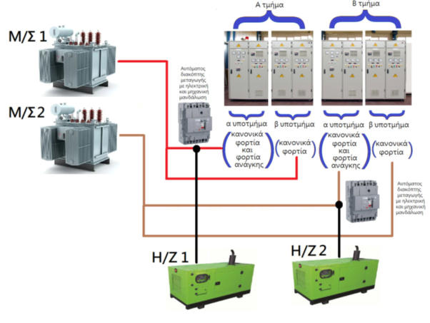 Τοηλεκτροπαραγωγόζεύγοςεκτελεί,μέσωεπιτηρητήτάσης,τοσυνεχήέλεγχοτηςπαροχήςτου δικτύουδιανομήςκαιεφόσονκαιοιτρειςφάσειςαυτήςέχουνκανονικήτάσηθακαταλήγειστον πίνακαδιανομήςπροςκατανάλωσης.Σεπερίπτωσηδιακοπήςήακαταλληλότηταςτουρεύματος σεμιαήπερισσόερεςφάσεις,θαενεργοποιείταιαυτόματαειδικόσύστημαπουθαδιακόπτει τηνρευματοδότησημέσωτουδικτύουκαιθαεκκινείτοΗ/Ζγιανααναλάβειταφορτίατης κατανάλωσης.Μετάτηναποκατάστασηκαιτωντριώνφάσεωνστιςκανονκέςτιμές,θα διακόπτεταιηρευματοδότησητηςεγκατάστασηςαπότηγεννήτριακαιθαγίνεταιημεταγωγή τωνφορτίωντηςκατανάλωσηςστοεθνικίοδίκτυοδιανομήςκαιτοΗ/Ζθαεπανέρχεταιστη θέση της επικουρικής ετοιμότητας