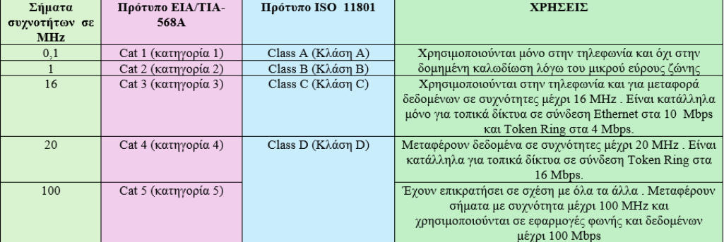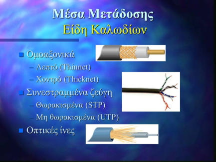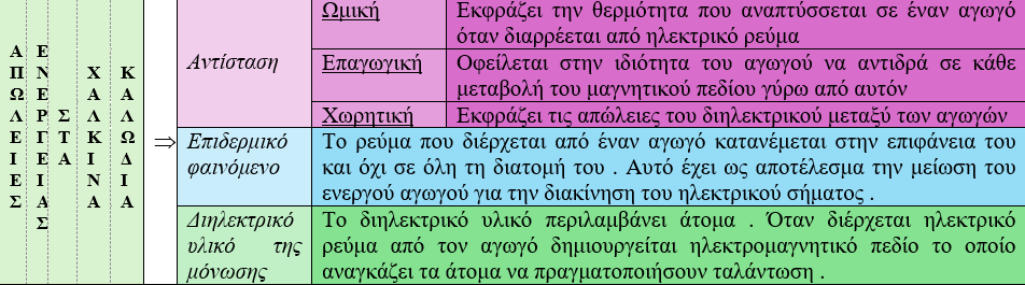 1.ΓΕΝΙΚΑΣημείωση: Τα ομοαξονικά καλώδια έχουν σχεδόν αντικατασταθεί πλήρως από χάλκινα καλώδια συνεστραμμένων ζευγώνΠαρατηρήσειςΌσο μεγαλύτερο είναι το εύρος ζώνης τόσο περισσότερες πληροφορίες μπορούν να μεταδώσουν σε συγκεκριμένο χρονικό διάστημα .Στις ψηφιακές μεταδόσεις η ταχύτητα μετάδοσης μετριέται σε bits ανά sec .Ηλεκτρονικός θόρυβος ονομάζεται το σύνολο των ανεπιθύμητων ηλεκτρικών σημάτων που αλλοιώνουν το μεταδιδόμενο σήμα . Ηλεκτρικό θόρυβο δημιουργεί κάθε μηχανισμός που χρησιμοποιεί ή δημιουργεί ηλεκτρική εναλλασσόμενη τάση 2.ΧΑΛΚΙΝΑ ΚΑΛΩΔΙΑ2.1 ΑΠΩΛΕΙΑ ΕΝΕΡΓΕΙΑΣ ΣΤΑ ΧΑΛΚΙΝΑ ΚΑΛΩΔΙΑΠαρατηρήσεις :Η σύνθετη αντίσταση μιας γραμμής αναφέρεται πάντα σε μια συχνότητα και παραμένει σχεδόν σταθερή σε όλο το μήκος της γραμμής Ο ίδιος αγωγός που παρουσιάζει σύνθετη αντίσταση Ζ1 για συχνότητα f1 , θα παρουσιάσει άλλη σύνθετη αντίσταση Ζ2 για συχνότητα f2 .Το επιδερμικό φαινόμενο είναι εντονότερο όταν αυξάνεται η συχνότητα του σήματος , διότι οι απώλειες ενός σήματος είναι ανάλογες προς την τετραγωνική ρίζα της συχνότητας του .Οι μονόκλωνοι αγωγοί παρουσιάζουν μικρότερη εξασθένηση από τους πολύκλωνους για την ίδια συχνότητα .Σε περιπτώσεις που το καλώδιο μετάδοσης πληροφοριών περνάει από χώρους υψηλής θερμοκρασίας θα πρέπει να επιλέγουμε καλώδιο με μονωτικό χαμηλών απωλειών καθώς επίσης θα πρέπει να φροντίζουμε για τον εξαερισμό των καλωδίων . Σε χώρους με υψηλή θερμοκρασία δεν χρησιμοποιούμε καλώδια με μόνωση PVC .Η εξασθένηση ενός σήματος ονομάζεται απόσβεση .Η σύνθετη αντίσταση (δηλαδή η αντίσταση που περιλαμβάνει την ωμική , επαγωγική και χωρητική δίνεται από την σχέση :Η επαγωγική αντίσταση είναι ανάλογη της συχνότητας του διερχόμενου σήματος .Η χωρητική αντίσταση είναι αντιστρόφως ανάλογη της συχνότητας του διερχόμενου σήματος .Το επιδερμικό φαινόμενο είναι τόσο πιο έντονο όσο αυξάνεται η συχνότητα του σήματος .Οι απώλειες λόγω της ταλάντωσης των ατόμων του διηλεκτρικού αυξάνονται με την θερμοκρασία .2.2 ΝΤΕΣΙΜΠΕΛΑποτελεί μονάδα μέτρησης του λόγου ισχύος δύο σημάτων και ορίζεται ως εξής :Τα ντεσιμπέλ δείχνουν πόσο μεταβλήθηκε – αυξήθηκε ή μειώθηκε – η ισχύς σε ένα σημείο 2 σε σχέση με ένα σημείο 1 .Επίσης το ντεσιμπέλ ορίζεται και με την ακόλουθη σχέση :όπου : U1 η τάση του σήματος με ισχύ Ρ1 .U2 η τάση του σήματος με ισχύ Ρ2 .Όταν Ρ2 < Ρ1 τότε το σήμα έχει εξασθενήσει .Όταν Ρ2 > Ρ1 τότε το σήμα έχει ενισχυθεί .2.3 ΛΟΓΟΣ ΣΗΜΑΤΟΣ ΠΡΟΣ ΘΟΡΥΒΟΟ λόγος σήματος προς θόρυβο ( S/N ) εκφράζει τη σχετική στάθμη του σήματος πληροφορίας ως προς τη στάθμη του θορύβου . Εκφράζεται σε dB .Όσο μεγαλύτερος είναι ο λόγος σήματος προς θόρυβο τόσο πιο αξιόπιστη θεωρείται η μετάδοση της πληροφορίας .2.4 ΚΑΛΩΔΙΑ ΣΥΝΕΣΤΡΑΜΜΕΝΩΝ ΖΕΥΓΩΝΑποτελούνται από ζεύγη μονόκλωνων χάλκινων μονωμένων αγωγών . Μεταφέρουν αναλογικά σήματα για ακουστικές συχνότητες (300-3400 Hz) και ψηφιακά σήματα για μικρές όμως αποστάσεις .Οι αγωγοί είναι συνεστραμμένα ανά δύο . Εάν οι αγωγοί δεν ήταν συνεστραμμένοι ανά δύο σε ζεύγη αλλά βρισκόντουσαν παράλληλα ο ένας αγωγός με τον άλλο , τότε θα εμφανιζόντουσαν χωρητικές και επαγωγικές αντιστάσεις μεταξύ τους οι οποίες θα δημιουργούσαν ανεπιθύμητο ηλεκτρικό θόρυβο .Επίσης όταν οι αγωγοί είναι συνεστραμμένοι , επηρεάζονται λιγότερο από τις ηλεκτρομαγνητικές παρεμβολές του περιβάλλοντος χώρου καθώς και από τον ηλεκτρικό θόρυβο που δη