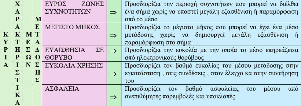 Κριτήρια επιλογής μέσου μετάδοσηςΕύρος ζώνηςΜέγιστη απόσταση μετάδοσης χωρίς αναμεταδότεςΕυαισθησία στο θόρυβοΕυκολία χρήσηςΑριθμός συσκευών που θα συνδεθούνΑσφάλεια