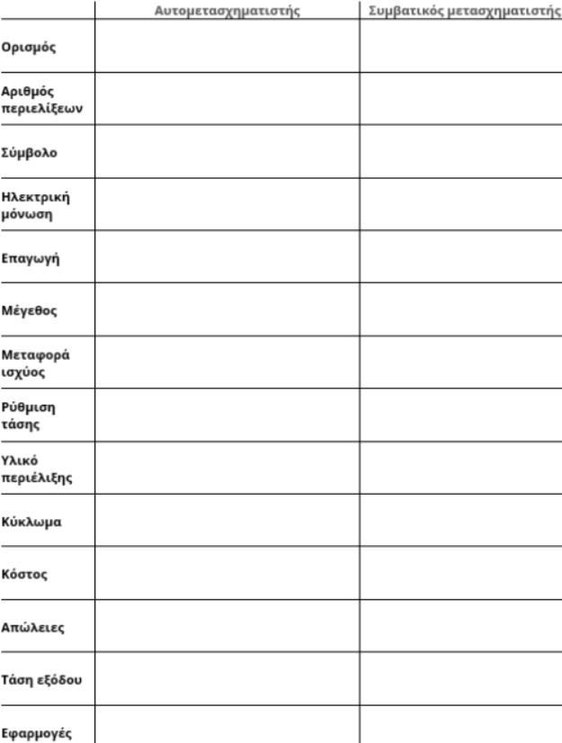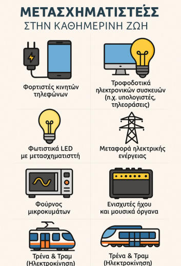 ΜΕΤΑΣΧΗΜΑΤΙΣΤΕΣ1 . ΕισαγωγήΟμετασχηματιστήςείναιμιασυσκευήηοποίαμεταφέρειηλεκτρικήενέργειαμεταξύδύοκυκλωμάτων,διαμέσουενόςπυρήνααπό σιδηρομαγνητικόυλικόπουσυνδέειμαγνητικάταδύοκυκλώματα.Οιμετασχηματιστέςείναιανάμεσαστιςπιοαποδοτικέςηλεκτρικέςμηχανές,με κάποιεςμεγάλεςμονάδεςνααποδίδουνέωςκαιτο99.75%τηςισχύοςεισόδουτουςστηνέξοδότους.Οιμετασχηματιστέςκατασκευάζονταισε ευρείαγκάμαμεγεθών,πουκυμαίνονταιαπόμέγεθοςνυχιού(όπωςαυτοίπουβρίσκονταιμέσασεέναμικρόφωνο)έωςτεράστιεςμονάδεςμεβάρος εκατοντάδωντόνωνπουχρησιμοποιούνταιγιατηδιασύνδεσητμημάτωντωνεθνικώνδικτύωνηλεκτροδότησης.Όλοιλειτουργούνμεβάσητις ίδιες αρχές, αν και υπάρχει πληθώρα διαφορετικών υλοποιήσεων.2 . Είδη και Χρήσεις ΜετασχηματιστώνΟμετασχηματιστήςείναιμιαηλεκτρικήσυσκευήπουχρησιμοποιείταιγιαναμεταβάλλειτηντάση(καιτηνένταση)ενόςεναλλασσόμενουρεύματος (AC), χωρίς να αλλάζει η συχνότητά του. Δηλαδή αυξομειώνει τα βασικά ηλεκτρικά μεγέθη (τάση-ένταση) ανάλογα με το είδος του. Είναι μη στρεφόμενη ηλεκτρική μηχανή που αποτελείται από:Ένα πυρήνα από σιδηρομαγνητικό υλικόΔύο πηνία (τυλίγματα) γύρωαπότονπυρήνα.Ένατύλιγμαυψηλήςτάσης(Υ.Τ.)καιένατύλιγμαχαμηλήςτάσης(Χ.Τ.)Συμβατικάονομάζονται πρωτεύον και δευτερεύον αντίστοιχα .ΣτηνπράξηοιΜ/Σχρησιμοποιούνταισεπεριπτώσειςπουαπαιτείταιναέχουμεμέγεθοςτάσηςδιαφορετικόαπόαυτόπουδιαθέτουμε.ΟΜ/Σέχει δύο ονομαστικές τιμές τάσης : μία για το πρωτεύον (U1) και μία για το δευτερεύον(U2) .ΕρώτησηΠροβληματισμού:Τινομίζειςότιθασυμβείστηντάσηενόςκυκλώματοςαντυλίξουμεπερισσότεραήλιγότεραπηνίαστοδευτερεύον πηνίο ενός μετασχηματιστή; …………………………………………………………………………………….Πείραμα & ΠαρατήρησηΥλικά (πραγματικά ή μέσω προσομοίωσης):Πηγή εναλλασσόμενης τάσης (AC)Μετασχηματιστής με δυνατότητα αλλαγής σπειρών στο πρωτεύον και δευτερεύον τύλιγμαΠολύμετροΟδηγίες:Συνδέστε την πηγή στο πρωτεύον.Αλλάξτε τον αριθμό των σπειρών στο δευτερεύον (π.χ. 20, 40, 80).Καταγράψτε την έξοδο (τάση) κάθε φορά.Πίνακας Καταγραφής:Ανάλυση & ΣυμπεράσματαΑπάντησε στις παρακάτω ερωτήσεις:Παρατήρησες κάποια σχέση μεταξύ των σπειρών και της τάσης εξόδου; Ποια; …………………………………………………………………………………….Πότε ο μετασχηματιστής λειτούργησε ως ανύψωσης και πότε ως υποβίβασης; …………………………………………………………………………………….Πώς συνδέεται η αναλογία σπειρών με την αναλογία τάσεων; …………………………………………………………………………………….Ποια είναι η βασική αρχή λειτουργίας ενός μετασχηματιστή (υπόδειξη: ηλεκτρομαγνητική επαγωγή); …………………………………………………………………………Παραδείγματα από την καθημερινή ζωή όπου χρησιμοποιούνται μετασχηματιστές1. Φορτιστές κινητών τηλεφώνωνΠεριέχουν μικρούς μετασχηματιστές που μετατρέπουν την υψηλή τάση από το δίκτυο (230V) σε χαμηλή τάση (π.χ. 5V ή 9V) κατάλληλη για φόρτιση.2. Τροφοδοτικά ηλεκτρονικών συσκευών (π.χ. υπολογιστές, τηλεοράσεις)Τα τροφοδοτικά χρησιμοποιούν μετασχηματιστές για να μειώσουν την τάση και να παρέχουν την κατάλληλη για τη λειτουργία του κυκλώματος.3. Φωτιστικά LED με μετασχηματιστήΠολλά LED φωτιστικά έχουν εσωτερικό μετασχηματιστή για να μετατρέπουν την τάση από AC σε χαμηλή DC.4. Μεταφορά ηλεκτρικής ενέργειαςΣτους πυλώνες υψηλής τάσης, οι μετασχηματιστές ανυψώνουν την τάση ώστε να μειωθούν οι απώλειες κατά τη μεταφορά.Στους υποσταθμούς 