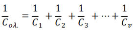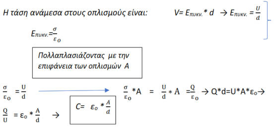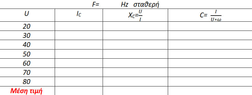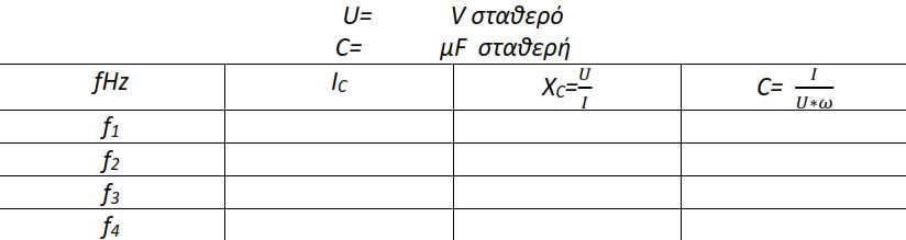 Μέτρηση Χωρητικότητας Πυκνωτή (C) Α. ΘΕΩΡΗΤΙΚΟ ΜΕΡΟΣΠυκνωτής,είναιμιαδιάταξηδύοαγωγών(οπλισμών)πουδιαχωρίζονταιαπόκάποιομονωτή.Οιμεταλλικέςπλάκεςονομάζονταιοπλισμοίκαιτο μονωτικό,διηλεκτρικό.Ταμονωτικάυλικάπουχρησιμοποιούνταιωςδιηλεκτρικάείναιδιάφορακεραμικάκαισυνθετικάυλικά,χαρτί,λάδι,αέραςκ.λ.π. Οιδύοαγωγοίέχουνίσοκαιαντίθετοφορτίο.Οαγωγόςμετοθετικόφορτίοέχειμεγαλύτεροδυναμικό.Τοηλεκτρικόπεδίομεταξύτωνοπλισμών,άρα η διαφορά δυναμικού είναι ανάλογη του φορτίου ( νόμος Gauss). Ο λόγος αυτός είναι σταθερός και ονομάζεται χωρητικότητας C με μονάδα 1 F. Κάθεπυκνωτήςχαρακτηρίζεταιαπότηνχωρητικότητάτου,δηλαδήτηνικανότηταπουέχεινασυγκρατείστουςοπλισμούτουηλεκτρικάφορτία.Το μέγεθοςτηςχωρητικότηταςκαθορίζεταιαπότιςδιαστάσειςτωνοπλισμώναπότηνμεταξύτουςαπόστασηκαιαπότοείδοςτουδιηλεκτρικούτου πυκνωτή.Οαπλούστεροςτύποςενόςπυκνωτήείναιοεπίπεδος:δύοπαράλληλεςεπίπεδεςαγώγιμεςπλάκεςμεεμβαδόνΑκαιαπόστασηd.Εξαιτίαςτηςέλξης των αντίθετων φορτίων τα περισσότερα φορτία θα είναι στις απέναντι εσωτερικές επιφάνειες των πλακών. Το ηλεκτρικό πεδίο Ε στο χώρο μεταξύτων πλακών, έχει την ίδια επιφανειακή πυκνότητα δηλαδή δημιουργείται ένα ομογενές πεδίο. Η ένταση αυτή είναι : όπου σ: επιφανειακή πυκνότητα φορτίου. Το ηλεκτρικό φορτίο που περικλείεται από τη επιφάνεια είναι ίσο με :Έξω από τις πλάκες η ένταση του πεδίου είναι μηδέν αφού τα πεδία αλληλοαναιρούνται (σχηματίζονται θετικά και αρνητικά πεδία).η χωρητικότητα πυκνωτή με παράλληλους οπλισμούς.Δηλαδή η χωρητικότητα είναι σταθερή και εξαρτάται μόνο από τα χαρακτηριστικά του πυκνωτή. Σύνδεση πυκνωτώνΣε σειρά: όλοι οι πυκνωτές έχουν το ίδιο φορτίο στην περιοχή μεταξύ δυο πυκνωτών ο ένας οπλισμός του ενός πυκνωτή έχει θετικό φορτίο και ο αντίστοιχός του άλλου αρνητικό η ολική χωρητικότητα δίνεται από τη σχέση:Παράλληλα: όλοι οι πυκνωτές βρίσκονται στην ίδια διαφορά δυναμικό , το φορτίο τους κατανέμεται ανάλογα με την τιμή της χωρητικότητας και η ολική χωρητικότητα είναι: Πυκνωτή στο εναλλασσόμενοΠαρουσιάζει χωρητική αντίσταση και συμπεριφέρεται ως πηγή. Η χωρητική αντίσταση είναι:όπου ω η κυκλική συχνότητα του ρεύματος και είναι: Η φάση του ρεύματος σε κύκλωμα με πυκνωτή προπορεύεται κατά γωνία 90ο από την τάση που εφαρμόζεται στα άκρα του.Β. ΚΥΚΛΩΜΑ ΜΕΤΡΗΣΕΩΝΓ. ΠΟΡΕΙΑ ΕΡΓΑΣΙΑΣΜέτρηση της χωρητικότητας Απαραίτητα όργανα και συσκευές που απαιτούνται για την εκτέλεση της άσκησης: Γεννήτρια Χ.Σ- Βολτόμετρο A.C- Αμπερόμετρο A.C Μέτρηση με βολτόμετρο και αμπερόμετροΗμέτρησητηςχωρητικότηταςμπορείναεπιτευχθείμεαμπερόμετροκαιβολτόμετρομετηνπροϋπόθεσηότιείναιγνωστήησυχνότητατου εναλλασσόμενου ρεύματος. Πραγματοποιούμετοπαρακάτωκύκλωμα.Γιαπηγήχρησιμοποιούμεμιαγεννήτριαχαμηλήςσυχνότηταςκρατώνταςτηντάσηκαιτηνσυχνότητα σταθερή. Σημειώνουμε τις ενδείξεις των οργάνων. Εφαρμόζοντας τον νόμο του ΟΗΜ έχουμε :Η μέθοδος αυτή χρησιμοποιείται κυρίως στην βιομηχανία για πυκνωτές με μεγάλη χωρητικότητα. Να συμπληρώσετε τον Πίνακα 1Τροφοδοτούμετοκύκλωμαμεμιαγεννήτριαχαμηλήςσυχνότητας,κρατώνταςσταθερήτηντάσηκαιτησυχνότητα.Σημειώστετιςενδείξειςτου βολτόμετρουκαιτουαμπερόμετρουκαιτησυχνότητατηςγεννήτριαςΧ.Σστονπίνακααποτελεσμάτων(ηαντίστασηαπωλειώντουπυκνωτήμεμεγάλη προσέγγιση θεωρείται ότι είναι αμελητέα)Με την βοήθεια του προσομοιω