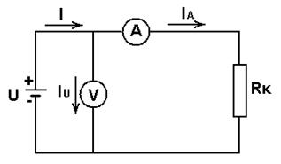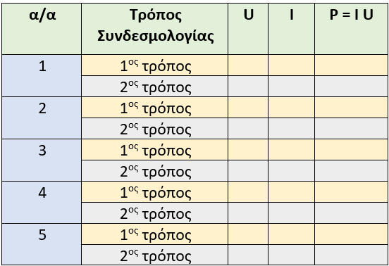 Υπολογισμός Ηλεκτρικής Ισχύος με Αμπερόμετρο και ΒολτόμετροΑ. ΘΕΩΡΗΤΙΚΟ ΜΕΡΟΣΗ ισχύς που παρέχεται από μια πηγή ΣΡ σε μια κατανάλωση ορίζεται από την σχέση :P = I Uόπου : U η τάση της κατανάλωσης Ι η ένταση της κατανάλωσης Άρα την ισχύ μιας κατανάλωσης μπορούμε να την υπολογίσουμε χρησιμοποιώντας ένα βολτόμετρο και ένα αμπερόμετρο ώστε να μετρήσουμε την τάση και την ένταση της κατανάλωσης αντίστοιχα . Η συνδεσμολογία του αμπερομέτρου και του βολτομέτρου μπορεί να γίνει με δύο τρόπους :α ΤρόποςΣχήμα 1Στην παραπάνω συνδεσμολογία το αμπερόμετρο μετράει , εκτός από το ρεύμα της κατανάλωσης , και το ρεύμα του βολτομέτρου . Δηλαδή μετράει μεγαλύτερο ρεύμα κατά ΙU = U / RU . Άρα το ρεύμα της κατανάλωσης είναι Ι = ΙΑ – ΙU Ι = ΙΑ – U / RU Δηλαδή η ισχύς της κατανάλωσης είναι : P = U (ΙΑ – U / RU ) . Συμπέρασμα : Για να έχουμε όσο το δυνατόν μικρότερο σφάλμα μέτρησης θα πρέπει το ρεύμα του βολτομέτρου ΙU να είναι όσο το δυνατόν μικρότερο σε σχέση με το ρεύμα της κατανάλωσης και αυτό επιτυγχάνεται όταν η αντίσταση του βολτομέτρου είναι όσο το δυνατόν μεγαλύτερη . β ΤρόποςΣτην παραπάνω συνδεσμολογία το βολτόμετρο μετράει , εκτός από την τάση της κατανάλωσης , και την τάση του αμπερομέτρου . Δηλαδή μετράει μεγαλύτερη ρεύμα τάση UA = I RA . Άρα η τάση της κατανάλωσης είναι U = UV – UA U = UV – I RAΔηλαδή η ισχύς της κατανάλωσης είναι : P = I (UV – I RA) . Συμπέρασμα : Για να έχουμε όσο το δυνατόν μικρότερο σφάλμα μέτρησης θα πρέπει η τάση του αμπερομέτρου UA να είναι όσο το δυνατόν μικρότερη σε σχέση με την τάση της κατανάλωσης και αυτό επιτυγχάνεται όταν η αντίσταση του αμπερομέτρου είναι όσο το δυνατόν μικρότερη . Β. ΚΥΚΛΩΜΑ ΜΕΤΡΗΣΕΩΝΓ. ΠΟΡΕΙΑ ΕΡΓΑΣΙΑΣΠραγματοποιήστε το 1ο κύκλωμα.Μετρήστε, με τη χρήση βολτομέτρου και αμπερομέτρου, την τάση και την ένταση της αντίστασης.Επαναλάβετε την μέτρηση χωρίς να αλλάξετε την τάση της πηγής, χρησιμοποιώντας το 2ο κύκλωμαΠραγματοποιήστε πέντε (5) μετρήσεις αλλάζοντας κάθε φορά την τάση της πηγής.Με βάση τις μετρήσεις σας και χρησιμοποιώντας τους τύπους τις ισχύς υπολογίστε την τιμή της ισχύος για κάθε μέτρησηΜπορείτε να πραγματοποιήσετε την εργαστηριακή άσκηση στο ακόλουθο εικονικό ηλεκτρολογικό εργαστήριοΔ. ΠΙΝΑΚΑΣ ΜΕΤΡΗΣΕΩΝΕ. ΣΥΜΠΕΡΑΣΜΑΤΑΕρώτηση: Τα αποτελέσματα του 1ου ή του 2ου τρόπου συνδεσμολογίας πιστεύετε ότι είναι περισσότερο ακριβείς;