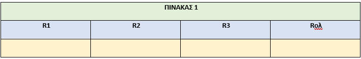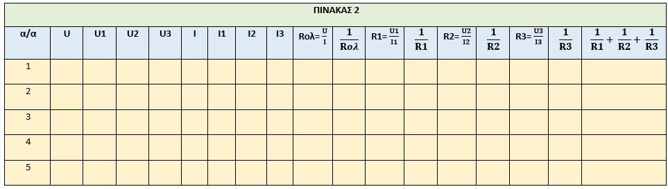 Παράλληλη Σύνδεση ΑντιστάσεωνΑ. ΘΕΩΡΗΤΙΚΟ ΜΕΡΟΣΌταν ένας αριθμός αντιστάσεων συνδέεται παράλληλα τότε οι αρχή τους συνδέεται με τον ένα πόλο της πηγής και το τέλος τους με τον άλλο πόλο της πηγής.Η παράλληλη σύνδεση καταναλωτών βρίσκει πολύ μεγάλο πεδίο εφαρμογών . Για παράδειγμα όλες οι οικιακές ηλεκτρικές καταναλώσεις συνδέονται παράλληλα με το δίκτυο . Βασικό χαρακτηριστικό των παράλληλα συνδεδεμένων καταναλώσεων είναι ότι στα άκρα τους εφαρμόζεται η ίδια τάση .Αντίθετα οι παράλληλα συνδεδεμένες καταναλώσεις διαρρέονται από διαφορετικές εντάσεις ηλεκτρικών ρευμάτων :Μάλιστα το άθροισμα των ρευμάτων των παράλληλα συνδεδεμένων καταναλώσεων ισούτε με το ρεύμα της πηγής . Η παραπάνω διατύπωση αποτελεί τον 1ο κανόνα του Κιρκωφ σύμφωνα με τον οποίο : Το άθροισμα των ρευμάτων που εισέρχονται σε ένα κόμβο ισούτε με το άθροισμα των ρευμάτων που εξέρχονται από αυτόν . Ένα σύνολο αντιστάσεων συνδεδεμένων παράλληλα μπορεί να αντικατασταθεί με μία αντίσταση της οποίας η τιμή ορίζεται από την σχέση :1/Rολ = 1/R1 + 1/R2 + 1/R3 + … + 1/RνΒ. ΚΥΚΛΩΜΑ ΜΕΤΡΗΣΕΩΝΓ. ΠΟΡΕΙΑ ΕΡΓΑΣΙΑΣΜετρήστε με ένα ωμόμετρο την τιμή των τριών αντιστάσεων και μεταφέρετε τις τιμές τους στον πίνακα 1 .Συνδέστε τις τρεις αντιστάσεις παράλληλα , μετρήστε με ένα ωμόμετρο την ολική τους αντίσταση και μεταφέρετε την τιμη στον πίνακα 1 .Πραγματοποιήστε το παραπάνω κύκλωμα χρησιμοποιώντας τρεις αντιστάσειςΜετρήστε, με τη χρήση βολτομέτρων, τις τάσεις στα άκρα της πηγής και των τριών αντιστάσεων.Μετρήστε, με τη χρήση αμπερομέτρων, την ένταση του ρεύματος σε κάθε αντίσταση καθώς και στην πηγή.Πραγματοποιήστε πέντε (5) μετρήσεις αλλάζοντας κάθε φορά την τάση της πηγής.Συμπληρώστε τον πίνακα 2Μπορείτε να πραγματοποιήσετε την εργαστηριακή άσκηση στο ακόλουθο εικονικό ηλεκτρολογικό εργαστήριοΔ. ΠΙΝΑΚΑΣ ΜΕΤΡΗΣΕΩΝΕ. ΣΥΜΠΕΡΑΣΜΑΤΑΔραστηριότητα: Ποια είναι η σχέση της τιμής της ολικής αντίστασης με οποιαδήποτε από τις τιμές των επιμέρους παράλληλων αντιστάσεων; Τι συμπέρασμα βγάζετε από αυτό; Δραστηριότητα:Μεβάσητααποτελέσματαπουέχετεκαταγράψειστονπίνακα1,επιβεβαιώνεταιοκανόναςτων παράλληλων αντιστάσεων;Δραστηριότητα:Ποιοσυμπέρασμαεξάγετεαπότααποτελέσματαπουέχετεκαταγράψειστονπίνακα2σχετικάμε τις εντάσεις σε παράλληλες αντιστάσεις; Ποιος κανόνας επιβεβαιώνεται;Δραστηριότητα:Μεβάσητιςτιμέςτωντάσεωνσταάκρατηςπηγήςκαιτωναντιστάσεων,πιστεύετεότιοιοικιακές συσκευές συνδέονται παράλληλα ή σε σειρά στο δίκτυο της ΔΕΗ; Για ποιο λόγο;Δραστηριότητα:Μεβάσητααποτελέσματαπουέχετεκαταγράψειστονπίνακα2,επιβεβαιώνεταιοκανόναςτων παράλληλων αντιστάσεων;Δραστηριότητα:Όπωςπαρατηρήσατεστοκύκλωμαπουσυνδεσμολογήσατε,τααμπερόμετρατατοποθετήσατεσε σειράκαιταβολτόμετραπαράλληλαμετιςαντίστοιχεςαντιστάσειςπουθέλήσατεναμετρήσετε.Πιστεύετελοιπόν ότιηεσωτερικήαντίστασητουβολτομέτρουείναιμικρήήμεγάλη;Καιαντίστοιχα,ηεσωτερικήαντίστασητου αμπερομέτρουείναιμικρήήμεγάλη.Απαντήστελαμβάνονταςυπόψητοντρόπομετονοποίοσυνδέεταιτο αμπερόμετρο και το βολτόμετρο στο κύκλωμα.