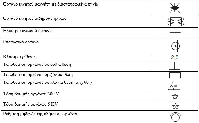 Τα σύμβολα που συναντάμε στην κλίμακα του οργάνου μέτρησης είναι:Που χαρακτηρίζουν το όργανο μέτρησης ως:1.Συνεχούς και εναλλασσόμενου Ρεύματοε2.Κινητού Σιδήρου3.Όρθιας Θέσης4.Κλάσης ακρίβειας 2,5