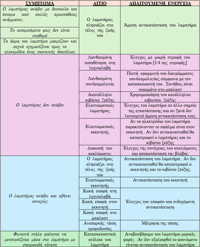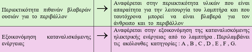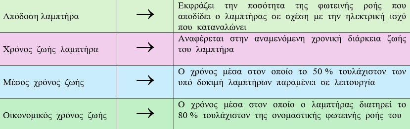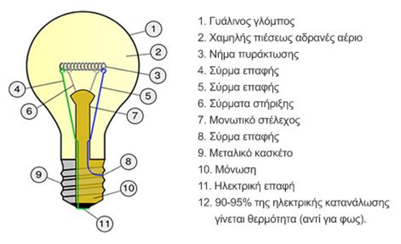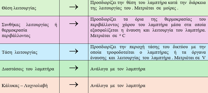 ΦΩΤΟΤΕΧΝΙΚΑ ΚΡΙΤΗΡΙΑΘερμοκρασία χρώματος TcΔείκτης χρωματικής απόδοσης RαΟΙΚΟΝΟΜΟΤΕΧΝΙΚΑ ΚΡΙΤΗΡΙΑΤΕΧΝΙΚΑ ΚΡΙΤΗΡΙΑΟΙΚΟΛΟΓΙΚΑ – ΠΕΡΙΒΑΛΛΟΝΤΙΚΑ ΚΡΙΤΗΡΙΑΚΑΤΑΣΚΕΥΑΣΤΙΚΑ ΜΕΡΗ ΛΑΜΠΤΗΡΑ ΠΥΡΑΚΤΩΣΕΩΣΝήμα τουγκστενίου ή βολφραμίου: Έχει διάμετρο περίπου 10 μm ( περίπου όσο μια ανθρώπινη τρίχα ) . Κατασκευάζεται σε τρεις μορφές : α . Ευθύγραμμη β . Ελικοειδής γ . Διπλή ελικοειδήςΠαρατηρήσεις : a.Όταν το νήμα κατασκευάζεται σε ελικοειδή ή διπλή ελικοειδή μορφή τότε εξασφαλίζεται α) η σμίκρυνση του μήκους του άρα απλουστεύεται η στήριξη του , β) η μεγαλύτερη απόδοση του λαμπτήρα .b.Το τουγκστένιο χρησιμοποιείται στην κατασκευή νημάτων διότι έχει υψηλό σημείο τήξεως .Ηλεκτρόδια (αγωγοί) : Τροφοδοτεί το νήμα με ηλεκτρικό ρεύμα . Ονομάζεται νήμα προσαγωγής .Στηρίγματα μολύβδου : Χρησιμοποιείται μόλυβδος διότι είναι χημικά αδρανές με το τουγκστένιο ( δηλαδή δεν αντιδρά με το τουγκστένιο όταν έρθουν σε επαφή )Κώδωνας (γυάλινο περίβλημα): Περιέχει το νήμα και το προφυλάσσει από το οξυγόνο ( το οξυγόνο οξειδώνει το νήμα και το καταστρέφει ) . Παρατηρήσεις :a.Οι λαμπτήρες μεγάλης ισχύος κατασκευάζονται από διαφανή κώδωνα .b.Οι λαμπτήρες μικρής ισχύος κατασκευάζονται από θαμπό κώδωνα ή από γυαλί με προσμίξεις πυριτίου .c.Όταν το αέριο που περιέχει ο κώδωνας είναι το κρυπτό τότε ο κώδωνας είναι μικρής διάστασης .Κάλυκας : Οι δύο συνήθης τύποι κάλυκα είναι : α) βιδωτός τύπος – χαρακτηρίζεται με το γράμμα Ε – που βιδώνεται στην λυχνιολαβή (ντουί) , β)μπαγιονέτ τύπος – χαρακτηρίζεται με το γράμμα Β – που στηρίζεται στην λυχνιολαβή με την βοήθεια δύο προεξοχών .Παρατήρηση : Δίπλα στα γράμματα Ε ή Β τοποθετείται από αριθμό που χαρακτηρίζει την διάμετρο του κάλυκα σε χιλιοστά (mm) .Αέριο : Χρησιμοποιείται κυρίως το αργό ή το άζωτο ή μίγμα αργού με άζωτο σε αναλογία 90/10 . Εμποδίζει την εξάχνωση του νήματος ( μετατροπή του στερεού νήματος σε αέριο ) . Όσο μεγαλύτερη είναι η πίεση του αερίου τόσο δυσκολότερα πραγματοποιείται η εξάχνωση . Όταν ο λαμπτήρας λειτουργεί τότε η πίεση του αερίου είναι 1,5 atm ενώ όταν δεν λειτουργεί η πίεση του αερίου είναι 0,9 atm Χρησιμοποιούνται κυρίως σε λαμπτήρες άνω των 40 W . Παρατήρηση : Το φαινόμενο της εξάχνωσης περιορίζεται με τον ακόλουθο τρόπο : Μέσα στον κώδωνα τοποθετείται μικρή ποσότητα αλογόνου αερίου ( κυρίως ιώδιο ) το οποίο αντιδρά χημικά με τα προϊόντα που απελευθερώνονται κατά την εξάχνωση του τουγκστενίου . Το προϊόν της χημικής αντίδρασης ονομάζεται αλογονίδιο του τουγκστενίου το οποίο επικάθεται στο νήμα και λόγω της υψηλής θερμοκρασίας ξαναδημιουργεί μέρος του τουγκστενίου . Οι παραπάνω λαμπτήρες ονομάζονται λαμπτήρες ιωδίνης . Το νήμα τους λειτουργεί σε υψηλότερη θερμοκρασία και παρέχει καλύτερο βαθμό απόδοσης . Έχουν χρόνο ζωής 2000 ώρες ( περίπου διπλάσιο από τους κοινούς λαμπτήρες πυράκτωσης ) . Κατασκευάζονται σε ελάχιστες διαστάσεις και παρέχουν σταθερή φωτεινή ροή .ΕΙΔΗ ΛΑΜΠΤΗΡΩΝ ΠΥΡΑΚΤΩΣΗΣ1.ΚΟΙΝΟΙ ΛΑΜΠΤΗΡΕΣ , ΔΙΑΦΑΝΕΙΣΔημιουργούν ευχάριστο φωςΧρησιμοποιούνται για οικιακό φωτισμόΔιατίθονται σε Ε27 και Β222.ΛΑΜΠΤΗΡΕΣ ΚΕΡΙΑΔιατίθονται σε μινιόν ματ (για απαλό φως) και σε μινιόν διαφανές (για λαμπερό φως ) Χρησιμοποιούνται για διακοσμητικό φωτισμό3.ΣΦΑΙΡΙΚΟΙ ΛΑΜΠΤΗΡΕΣΔιατίθενται σε κανονικό και σε μινιόν κάλυμμα .Χρησιμοποιούνται για διακοσμητικό φωτισμό4.ΛΑΜΠΤΗΡΕΣ ARGENTAΔημιουργούν ευχάριστο φως που διαχέεται ομοιόμο